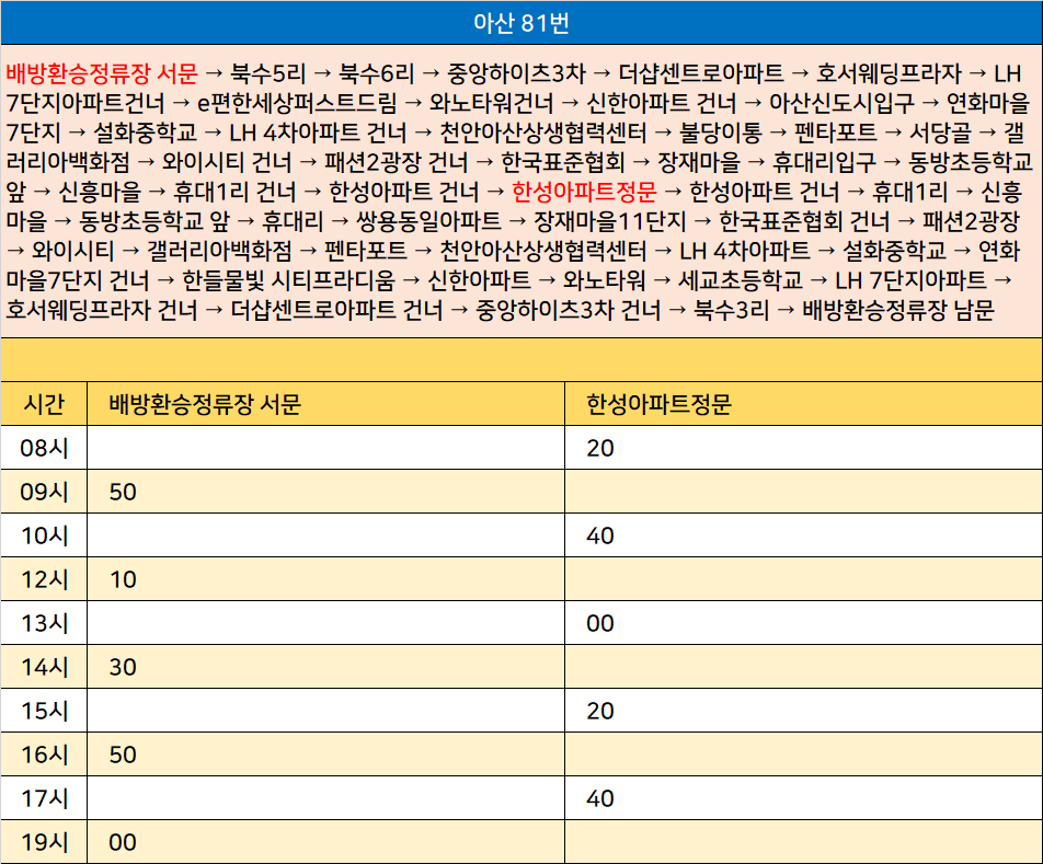 아산 81번: 배방환승정류장 서문 → 북수5리 → 북수6리 → 중앙하이츠3차 → 더샵센트로아파트 → 호서웨딩프라자 → LH 7단지아파트건너 → e편한세상퍼스트드림 → 와노타워건너 → 신한아파트 건너 → 아산신도시입구 → 연화마을7단지 → 설화중학교 → LH 4차아파트 건너 → 천안아산상생협력센터 → 불당이통 → 펜타포트 → 서당골 → 갤러리아백화점 → 와이시티 건너 → 패션2광장 건너 → 한국표준협회 → 장재마을 → 휴대리입구 → 동방초등학교앞 → 신흥마을 → 휴대1리 건너 → 한성아파트 건너 → 한성아파트정문 → 한성아파트 건너 → 휴대1리 → 신흥마을 → 동방초등학교 앞 → 휴대리 → 쌍용동일아파트 → 장재마을11단지 → 한국표준협회 건너 → 패션2광장 → 와이시티 → 갤러리아백화점 → 펜타포트 → 천안아산상생협력센터 → LH 4차아파트 → 설화중학교 → 연화마을7단지 건너 → 한들물빛 시티프라디움 → 신한아파트 → 와노타워 → 세교초등학교 → LH 7단지아파트 → 호서웨딩프라자 건너 → 더샵센트로아파트 건너 → 중앙하이츠3차 건너 → 북수3리 → 배방환승정류장 남문