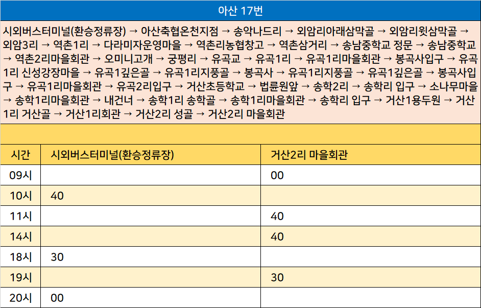 아산 17번: 시외버스터미널(환승정류장) → 아산축협온천지점 → 송악나드리 → 외암리아래삼막골 → 외암리윗삼막골 → 외암3리 → 역촌1리 → 다라미자운영마을 → 역촌리농협창고 → 역촌삼거리 → 송남중학교 정문 → 송남중학교 → 역촌2리마을회관 → 오미니고개 → 궁평리 → 유곡교 → 유곡1리 → 유곡1리마을회관 → 봉곡사입구 → 유곡1리 신성강장마을 → 유곡1깊은골 → 유곡1리지풍골 → 봉곡사 → 유곡1리지풍골 → 유곡1깊은골 → 봉곡사입구 → 유곡1리마을회관 → 유곡2리입구 → 거산초등학교 → 법륜원앞 → 송학2리 → 송학리 입구 → 소나무마을 → 송학1리마을회관 → 내건너 → 송학1리 송학골 → 송학1리마을회관 → 송학리 입구 → 거산1용두원 → 거산1리 거산골 → 거산1리회관 → 거산2리 성골 → 거산2리 마을회관