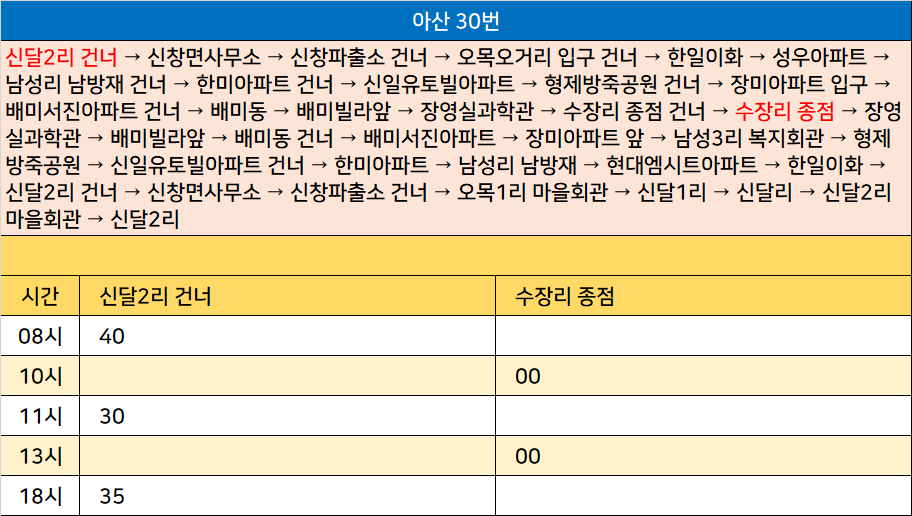 아산 30번: 신달2리 건너 → 신창면사무소 → 신창파출소 건너 → 오목오거리 입구 건너 → 한일이화 → 성우아파트 → 남성리 남방재 건너 → 한미아파트 건너 → 신일유토빌아파트 → 형제방죽공원 건너 → 장미아파트 입구 → 배미서진아파트 건너 → 배미동 → 배미빌라앞 → 장영실과학관 → 수장리 종점 건너 → 수장리 종점 → 장영실과학관 → 배미빌라앞 → 배미동 건너 → 배미서진아파트 → 장미아파트 앞 → 남성3리 복지회관 → 형제방죽공원 → 신일유토빌아파트 건너 → 한미아파트 → 남성리 남방재 → 현대엠시트아파트 → 한일이화 → 신달2리 건너 → 신창면사무소 → 신창파출소 건너 → 오목1리 마을회관 → 신달1리 → 신달리 → 신달2리마을회관 → 신달2리