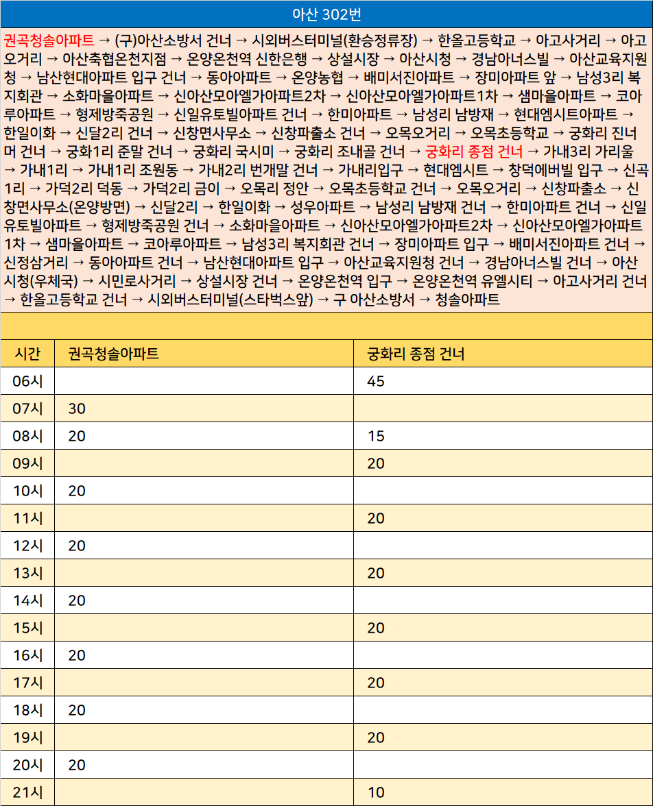 아산 302번: 권곡청솔아파트 → (구)아산소방서 건너 → 시외버스터미널(환승정류장) → 한올고등학교 → 아고사거리 → 아고오거리 → 아산축협온천지점 → 온양온천역 신한은행 → 상설시장 → 아산시청 → 경남아너스빌 → 아산교육지원청 → 남산현대아파트 입구 건너 → 동아아파트 → 온양농협 → 배미서진아파트 → 장미아파트 앞 → 남성3리 복지회관 → 소화마을아파트 → 신아산모아엘가아파트2차 → 신아산모아엘가아파트1차 → 샘마을아파트 → 코아루아파트 → 형제방죽공원 → 신일유토빌아파트 건너 → 한미아파트 → 남성리 남방재 → 현대엠시트아파트 → 한일이화 → 신달2리 건너 → 신창면사무소 → 신창파출소 건너 → 오목오거리 → 오목초등학교 → 궁화리 진너머 건너 → 궁화1리 준말 건너 → 궁화리 국시미 → 궁화리 조내골 건너 → 궁화리 종점 건너 → 가내3리 가리울 → 가내1리 → 가내1리 조원동 → 가내2리 번개말 건너 → 가내리입구 → 현대엠시트 → 창덕에버빌 입구 → 신곡1리 → 가덕2리 덕동 → 가덕2리 금이 → 오목리 정안 → 오목초등학교 건너 → 오목오거리 → 신창파출소 → 신창면사무소(온양방면) → 신달2리 → 한일이화 → 성우아파트 → 남성리 남방재 건너 → 한미아파트 건너 → 신일유토빌아파트 → 형제방죽공원 건너 → 소화마을아파트 → 신아산모아엘가아파트2차 → 신아산모아엘가아파트1차 → 샘마을아파트 → 코아루아파트 → 남성3리 복지회관 건너 → 장미아파트 입구 → 배미서진아파트 건너 → 신정삼거리 → 동아아파트 건너 → 남산현대아파트 입구 → 아산교육지원청 건너 → 경남아너스빌 건너 → 아산시청(우체국) → 시민로사거리 → 상설시장 건너 → 온양온천역 입구 → 온양온천역 유엘시티 → 아고사거리 건너 → 한올고등학교 건너 → 시외버스터미널(스타벅스앞) → 구 아산소방서 → 청솔아파트