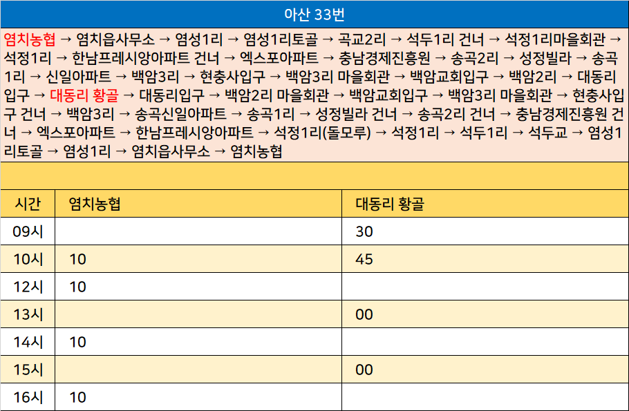 아산 33번: 염치농협 → 염치읍사무소 → 염성1리 → 염성1리토골 → 곡교2리 → 석두1리 건너 → 석정1리마을회관 → 석정1리 → 한남프레시앙아파트 건너 → 엑스포아파트 → 충남경제진흥원 → 송곡2리 → 성정빌라 → 송곡1리 → 신일아파트 → 백암3리 → 현충사입구 → 백암3리 마을회관 → 백암교회입구 → 백암2리 → 대동리입구 → 대동리 황골 → 대동리입구 → 백암2리 마을회관 → 백암교회입구 → 백암3리 마을회관 → 현충사입구 건너 → 백암3리 → 송곡신일아파트 → 송곡1리 → 성정빌라 건너 → 송곡2리 건너 → 충남경제진흥원 건너 → 엑스포아파트 → 한남프레시앙아파트 → 석정1리(돌모루) → 석정1리 → 석두1리 → 석두교 → 염성1리토골 → 염성1리 → 염치읍사무소 → 염치농협