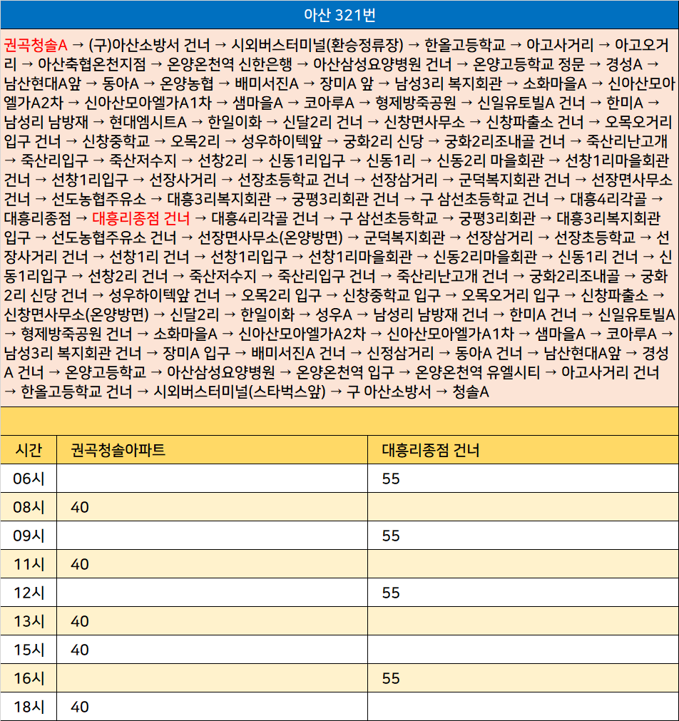 아산 321번: 권곡청솔A → (구)아산소방서 건너 → 시외버스터미널(환승정류장) → 한올고등학교 → 아고사거리 → 아고오거리 → 아산축협온천지점 → 온양온천역 신한은행 → 아산삼성요양병원 건너 → 온양고등학교 정문 → 경성A → 남산현대A앞 → 동아A → 온양농협 → 배미서진A → 장미A 앞 → 남성3리 복지회관 → 소화마을A → 신아산모아엘가A2차 → 신아산모아엘가A1차 → 샘마을A → 코아루A → 형제방죽공원 → 신일유토빌A 건너 → 한미A → 남성리 남방재 → 현대엠시트A → 한일이화 → 신달2리 건너 → 신창면사무소 → 신창파출소 건너 → 오목오거리 입구 건너 → 신창중학교 → 오목2리 → 성우하이텍앞 → 궁화2리 신당 → 궁화2리조내골 건너 → 죽산리난고개 → 죽산리입구 → 죽산저수지 → 선창2리 → 신동1리입구 → 신동1리 → 신동2리 마을회관 → 선창1리마을회관 건너 → 선창1리입구 → 선장사거리 → 선장초등학교 건너 → 선장삼거리 → 군덕복지회관 건너 → 선장면사무소 건너 → 선도농협주유소 → 대흥3리복지회관 → 궁평3리회관 건너 → 구 삼선초등학교 건너 → 대흥4리각골 → 대흥리종점 → 대흥리종점 건너 → 대흥4리각골 건너 → 구 삼선초등학교 → 궁평3리회관 → 대흥3리복지회관 입구 → 선도농협주유소 건너 → 선장면사무소(온양방면) → 군덕복지회관 → 선장삼거리 → 선장초등학교 → 선장사거리 건너 → 선창1리 건너 → 선창1리입구 → 선창1리마을회관 → 신동2리마을회관 → 신동1리 건너 → 신동1리입구 → 선창2리 건너 → 죽산저수지 → 죽산리입구 건너 → 죽산리난고개 건너 → 궁화2리조내골 → 궁화2리 신당 건너 → 성우하이텍앞 건너 → 오목2리 입구 → 신창중학교 입구 → 오목오거리 입구 → 신창파출소 → 신창면사무소(온양방면) → 신달2리 → 한일이화 → 성우A → 남성리 남방재 건너 → 한미A 건너 → 신일유토빌A → 형제방죽공원 건너 → 소화마을A → 신아산모아엘가A2차 → 신아산모아엘가A1차 → 샘마을A → 코아루A → 남성3리 복지회관 건너 → 장미A 입구 → 배미서진A 건너 → 신정삼거리 → 동아A 건너 → 남산현대A앞 → 경성A 건너 → 온양고등학교 → 아산삼성요양병원 → 온양온천역 입구 → 온양온천역 유엘시티 → 아고사거리 건너 → 한올고등학교 건너 → 시외버스터미널(스타벅스앞) → 구 아산소방서 → 청솔A