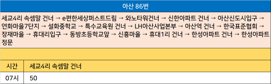 아산 86번: 세교4리 속셈말 건너 → e편한세상퍼스트드림 → 와노타워건너 → 신한아파트 건너 → 아산신도시입구 → 연화마을7단지 → 설화중학교 → 특수교육원 건너 → LH아산사업본부 → 아산역 건너 → 한국표준협회 → 장재마을 → 휴대리입구 → 동방초등학교앞 → 신흥마을 → 휴대1리 건너 → 한성아파트 건너 → 한성아파트정문
