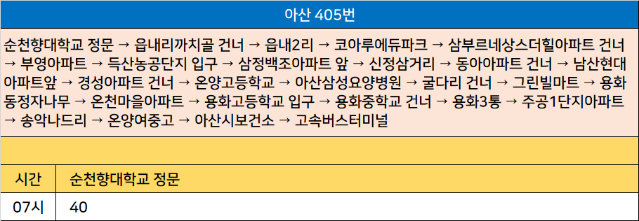 아산 405번: 순천향대학교 정문 → 읍내리까치골 건너 → 읍내2리 → 코아루에듀파크 → 삼부르네상스더힐아파트 건너 → 부영아파트 → 득산농공단지 입구 → 삼정백조아파트 앞 → 신정삼거리 → 동아아파트 건너 → 남산현대아파트앞 → 경성아파트 건너 → 온양고등학교 → 아산삼성요양병원 → 굴다리 건너 → 그린빌마트 → 용화동정자나무 → 온천마을아파트 → 용화고등학교 입구 → 용화중학교 건너 → 용화3통 → 주공1단지아파트 → 송악나드리 → 온양여중고 → 아산시보건소 → 고속버스터미널