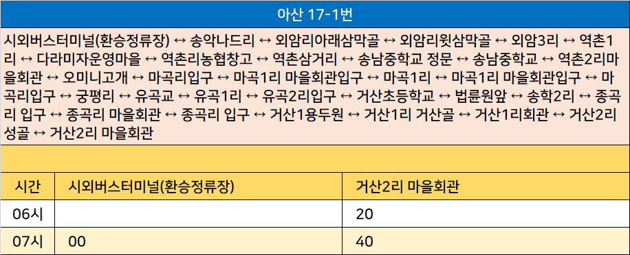 아산 17-1번: 시외버스터미널(환승정류장) ↔ 송악나드리 ↔ 외암리아래삼막골 ↔ 외암리윗삼막골 ↔ 외암3리 ↔ 역촌1리 ↔ 다라미자운영마을 ↔ 역촌리농협창고 ↔ 역촌삼거리 ↔ 송남중학교 정문 ↔ 송남중학교 ↔ 역촌2리마을회관 ↔ 오미니고개 ↔ 마곡리입구 ↔ 마곡1리 마을회관입구 ↔ 마곡1리 ↔ 마곡1리 마을회관입구 ↔ 마곡리입구 ↔ 궁평리 ↔ 유곡교 ↔ 유곡1리 ↔ 유곡2리입구 ↔ 거산초등학교 ↔ 법륜원앞 ↔ 송학2리 ↔ 종곡리 입구 ↔ 종곡리 마을회관 ↔ 종곡리 입구 ↔ 거산1용두원 ↔ 거산1리 거산골 ↔ 거산1리회관 ↔ 거산2리 성골 ↔ 거산2리 마을회관