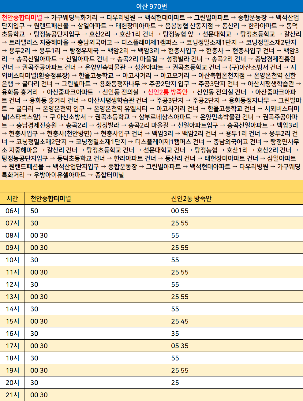 아산 970번: 천안종합터미널 → 가구웨딩특화거리 → 다우리병원 → 백석현대아파트 → 그린빌아파트 → 종합운동장 → 백석산업단지입구 → 원랜드패션몰 → 삼일아파트 → 태헌장미아파트 → 음봉농협 산동지점 → 동산리 → 한라아파트 → 동덕초등학교 → 탕정농공단지입구 → 호산2리 → 호산1리 건너 → 탕정농협 앞 → 선문대학교 → 탕정초등학교 → 갈산리 → 트라팰리스 지중해마을 → 충남외국어고 → 디스플레이제1캠퍼스 → 코닝정밀소재1단지 → 코닝정밀소재2단지 → 용두2리 → 용두1리 → 탕정우체국 → 백암2리 → 백암3리 → 현충사입구 → 현충사 → 현충사입구 건너 → 백암3리 → 송곡신일아파트 → 신일아파트 건너 → 송곡2리 마을길 → 성정빌라 건너 → 송곡2리 건너 → 충남경제진흥원 건너 → 권곡주공아파트 건너 → 온양민속박물관 → 성환아파트 → 권곡초등학교 건너 → (구)아산소방서 건너 → 시외버스터미널(환승정류장) → 한올고등학교 → 아고사거리 → 아고오거리 → 아산축협온천지점 → 온양온천역 신한은행 → 굴다리 건너 → 그린빌마트 → 용화동정자나무 → 주공2단지 입구 → 주공3단지 건너 → 아산시평생학습관 → 용화동 홍거리 → 아산줌파크아파트 → 신인동 전의실 → 신인2통 방죽안 → 신인동 전의실 건너 → 아산줌파크아파트 건너 → 용화동 홍거리 건너 → 아산시평생학습관 건너 → 주공3단지 → 주공2단지 → 용화동정자나무 → 그린빌마트 → 굴다리 → 온양온천역 입구 → 온양온천역 유엘시티 → 아고사거리 건너 → 한올고등학교 건너 → 시외버스터미널(스타벅스앞) → 구 아산소방서 → 권곡초등학교 → 삼부르네상스아파트 → 온양민속박물관 건너 → 권곡주공아파트 → 충남경제진흥원 → 송곡2리 → 성정빌라 → 송곡2리 마을길 → 신일아파트입구 → 송곡신일아파트 → 백암3리 → 현충사입구 → 현충사(천안방면) → 현충사입구 건너 → 백암3리 → 백암2리 건너 → 용두1리 건너 → 용두2리 건너 → 코닝정밀소재2단지 → 코닝정밀소재1단지 → 디스플레이제1캠퍼스 건너 → 충남외국어고 건너 → 탕정면사무소 지중해마을 → 갈산리 건너 → 탕정초등학교 건너 → 선문대학교 건너 → 탕정농협 → 호산1리 → 호산2리 건너 → 탕정농공단지입구 → 동덕초등학교 건너 → 한라아파트 건너 → 동산리 건너 → 태헌장미아파트 건너 → 삼일아파트 → 원랜드패션몰 → 백석산업단지입구 → 종합운동장 → 그린빌아파트 → 백석현대아파트 → 다우리병원 → 가구웨딩특화거리 → 우방아이유셀아파트 → 천안종합터미널