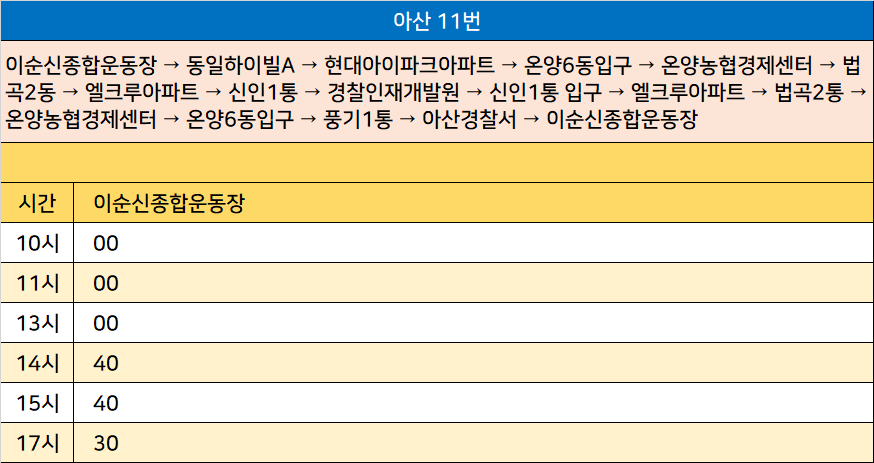 아산 11번: 이순신종합운동장 → 동일하이빌A → 현대아이파크아파트 → 온양6동입구 → 온양농협경제센터 → 법곡2동 → 엘크루아파트 → 신인1통 → 경찰인재개발원(회차) → 신인1통 입구 → 엘크루아파트 → 법곡2통 → 온양농협경제센터 → 온양6동입구 → 풍기1통 → 아산경찰서 → 이순신종합운동장