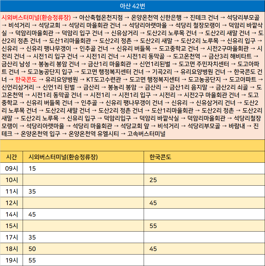 아산 42번: 시외버스터미널(환승정류장) → 아산축협온천지점 → 온양온천역 신한은행 → 진테크 건너 → 석당리부모골 → 비석거리 → 석당교회 → 석당리 마을회관 건너 → 석당리아랫마을 → 석당리 철장모랭이 → 덕암리 바깥삭실 → 덕암리마을회관 → 덕암리 입구 건너 → 신유삼거리 → 도산2리 노루목 건너 → 도산2리 새말 건너 → 도산2리 정촌 건너 → 도산1리마을회관 → 도산2리 정촌 → 도산2리 새말 → 도산2리 노루목 → 신유리 입구 → 신유리 → 신유리 팽나무갱이 → 인추골 건너 → 신유리 버들목 → 도고중학교 건너 → 시전2구마을회관 → 시전리 건너 → 시전1리 입구 건너 → 시전1리 건너 → 시전1리 동막골 → 도고온천역 → 금산3리 해비타트 → 금산리 남성 → 봉농리 봉암 건너 → 금산1리 마을회관 → 신언1리된벌 → 도고면 주민자치센터 → 도고아파트 건너 → 도고농공단지 입구 → 도고면 행정복지센터 건너 → 기곡2리 → 유리요양병원 건너 → 한국콘도 건너 → 한국콘도 → 유리요양병원 → KT도고수련관 → 도고면 행정복지센터 → 도고농공단지 → 도고아파트 → 신언리삼거리 → 신언1리 된벌 → 금산리 → 봉농리 봉암 → 금산리 → 금산1리 음지말 → 금산2리 쇠골 → 도고온천역 → 시전1리 동막골 건너 → 시전1리 → 시전1리 입구 → 시전리 → 시전2구 마을회관 건너 → 도고중학교 → 신유리 버들목 건너 → 인추골 → 신유리 팽나무갱이 건너 → 신유리 → 신유삼거리 건너 → 도산2리 노루목 건너 → 도산2리 새말 건너 → 도산2리 정촌 건너 → 도산1리마을회관 → 도산2리 정촌 → 도산2리 새말 → 도산2리 노루목 → 신유리 입구 → 덕암리입구 → 덕암리 바깥삭실 → 덕암리마을회관 → 석당리철장모랭이 → 석당리아랫마을 → 석당리 마을회관 → 석당교회 앞 → 비석거리 → 석당리부모골 → 바람내 → 진테크 → 온양온천역 입구 → 온양온천역 유엘시티 → 고속버스터미널
