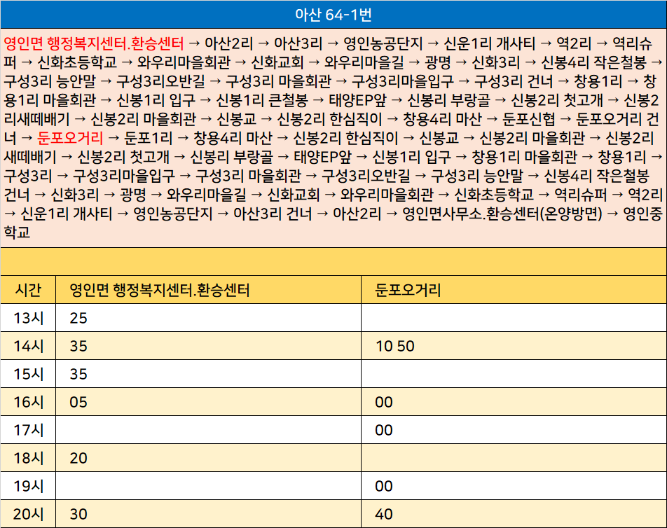 아산 64-1번: 영인면 행정복지센터.환승센터 → 아산2리 → 아산3리 → 영인농공단지 → 신운1리 개사티 → 역2리 → 역리슈퍼 → 신화초등학교 → 와우리마을회관 → 신화교회 → 와우리마을길 → 광명 → 신화3리 → 신봉4리 작은철봉 → 구성3리 능안말 → 구성3리오반길 → 구성3리 마을회관 → 구성3리마을입구 → 구성3리 건너 → 창용1리 → 창용1리 마을회관 → 신봉1리 입구 → 신봉1리 큰철봉 → 태양EP앞 → 신봉리 부랑골 → 신봉2리 첫고개 → 신봉2리새떼배기 → 신봉2리 마을회관 → 신봉교 → 신봉2리 한심직이 → 창용4리 마산 → 둔포신협 → 둔포오거리 건너 → 둔포오거리 → 둔포1리 → 창용4리 마산 → 신봉2리 한심직이 → 신봉교 → 신봉2리 마을회관 → 신봉2리새떼배기 → 신봉2리 첫고개 → 신봉리 부랑골 → 태양EP앞 → 신봉1리 입구 → 창용1리 마을회관 → 창용1리 → 구성3리 → 구성3리마을입구 → 구성3리 마을회관 → 구성3리오반길 → 구성3리 능안말 → 신봉4리 작은철봉 건너 → 신화3리 → 광명 → 와우리마을길 → 신화교회 → 와우리마을회관 → 신화초등학교 → 역리슈퍼 → 역2리 → 신운1리 개사티 → 영인농공단지 → 아산3리 건너 → 아산2리 → 영인면사무소.환승센터(온양방면) → 영인중학교
