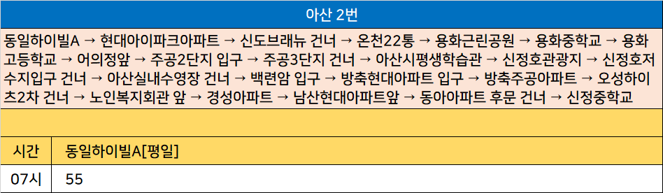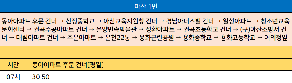 아산 시내버스 시간표 2025년 05월 15일 기준