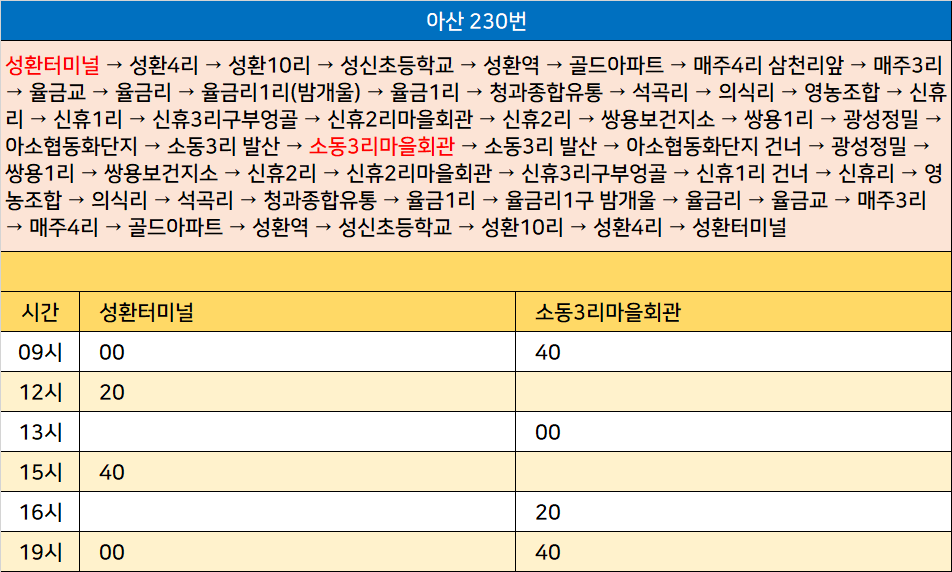 아산 230번: 성환터미널 → 성환4리 → 성환10리 → 성신초등학교 → 성환역 → 골드아파트 → 매주4리 삼천리앞 → 매주3리 → 율금교 → 율금리 → 율금리1리(밤개울) → 율금1리 → 청과종합유통 → 석곡리 → 의식리 → 영농조합 → 신휴리 → 신휴1리 → 신휴3리구부엉골 → 신휴2리마을회관 → 신휴2리 → 쌍용보건지소 → 쌍용1리 → 광성정밀 → 아소협동화단지 → 소동3리 발산 → 소동3리마을회관 → 소동3리 발산 → 아소협동화단지 건너 → 광성정밀 → 쌍용1리 → 쌍용보건지소 → 신휴2리 → 신휴2리마을회관 → 신휴3리구부엉골 → 신휴1리 건너 → 신휴리 → 영농조합 → 의식리 → 석곡리 → 청과종합유통 → 율금1리 → 율금리1구 밤개울 → 율금리 → 율금교 → 매주3리 → 매주4리 → 골드아파트 → 성환역 → 성신초등학교 → 성환10리 → 성환4리 → 성환터미널
