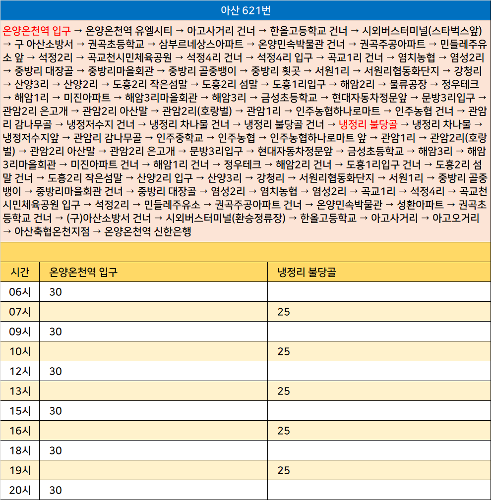 아산 621번: 온양온천역 입구 → 온양온천역 유엘시티 → 아고사거리 건너 → 한올고등학교 건너 → 시외버스터미널(스타벅스앞) → 구 아산소방서 → 권곡초등학교 → 삼부르네상스아파트 → 온양민속박물관 건너 → 권곡주공아파트 → 민들레주유소 앞 → 석정2리 → 곡교천시민체육공원 → 석정4리 건너 → 석정4리 입구 → 곡교1리 건너 → 염치농협 → 염성2리 → 중방리 대장골 → 중방리마을회관 → 중방리 골중뱅이 → 중방리 횟곳 → 서원1리 → 서원리협동화단지 → 강청리 → 산양3리 → 산양2리 → 도흥2리 작은섬말 → 도흥2리 섬말 → 도흥1리입구 → 해암2리 → 물류공장 → 정우테크 → 해암1리 → 미진아파트 → 해암3리마을회관 → 해암3리 → 금성초등학교 → 현대자동차정문앞 → 문방3리입구 → 관암2리 은고개 → 관암2리 아산말 → 관암2리(호랑벌) → 관암1리 → 인주농협하나로마트 → 인주농협 건너 → 관암리 감나무골 → 냉정저수지 건너 → 냉정리 차나물 건너 → 냉정리 불당골 건너 → 냉정리 불당골 → 냉정리 차나물 → 냉정저수지앞 → 관암리 감나무골 → 인주중학교 → 인주농협 → 인주농협하나로마트 앞 → 관암1리 → 관암2리(호랑벌) → 관암2리 아산말 → 관암2리 은고개 → 문방3리입구 → 현대자동차정문앞 → 금성초등학교 → 해암3리 → 해암3리마을회관 → 미진아파트 건너 → 해암1리 건너 → 정우테크 → 해암2리 건너 → 도흥1리입구 건너 → 도흥2리 섬말 건너 → 도흥2리 작은섬말 → 산양2리 입구 → 산양3리 → 강청리 → 서원리협동화단지 → 서원1리 → 중방리 골중뱅이 → 중방리마을회관 건너 → 중방리 대장골 → 염성2리 → 염치농협 → 염성2리 → 곡교1리 → 석정4리 → 곡교천시민체육공원 입구 → 석정2리 → 민들레주유소 → 권곡주공아파트 건너 → 온양민속박물관 → 성환아파트 → 권곡초등학교 건너 → (구)아산소방서 건너 → 시외버스터미널(환승정류장) → 한올고등학교 → 아고사거리 → 아고오거리 → 아산축협온천지점 → 온양온천역 신한은행