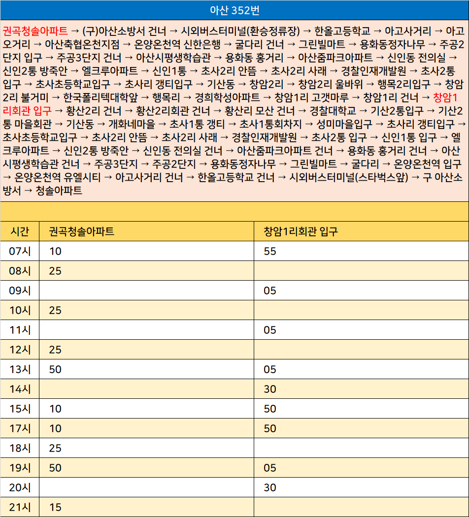 아산 352번: 권곡청솔아파트 → (구)아산소방서 건너 → 시외버스터미널(환승정류장) → 한올고등학교 → 아고사거리 → 아고오거리 → 아산축협온천지점 → 온양온천역 신한은행 → 굴다리 건너 → 그린빌마트 → 용화동정자나무 → 주공2단지 입구 → 주공3단지 건너 → 아산시평생학습관 → 용화동 홍거리 → 아산줌파크아파트 → 신인동 전의실 → 신인2통 방죽안 → 엘크루아파트 → 신인1통 → 초사2리 안뜸 → 초사2리 사래 → 경찰인재개발원 → 초사2통 입구 → 초사초등학교입구 → 초사리 갱티입구 → 기산동 → 창암2리 → 창암2리 울바위 → 행목2리입구 → 창암2리 불거미 → 한국폴리텍대학앞 → 행목리 → 경희학성아파트 → 창암1리 고갯마루 → 창암1리 건너 → 창암1리회관 입구 → 황산2리 건너 → 황산2리회관 건너 → 황산리 모산 건너 → 경찰대학교 → 기산2통입구 → 기산2통 마을회관 → 기산동 → 개화네마을 → 초사1통 갱티 → 초사1통회차지 → 성미마을입구 → 초사리 갱티입구 → 초사초등학교입구 → 초사2리 안뜸 → 초사2리 사래 → 경찰인재개발원 → 초사2통 입구 → 신인1통 입구 → 엘크루아파트 → 신인2통 방죽안 → 신인동 전의실 건너 → 아산줌파크아파트 건너 → 용화동 홍거리 건너 → 아산시평생학습관 건너 → 주공3단지 → 주공2단지 → 용화동정자나무 → 그린빌마트 → 굴다리 → 온양온천역 입구 → 온양온천역 유엘시티 → 아고사거리 건너 → 한올고등학교 건너 → 시외버스터미널(스타벅스앞) → 구 아산소방서 → 청솔아파트