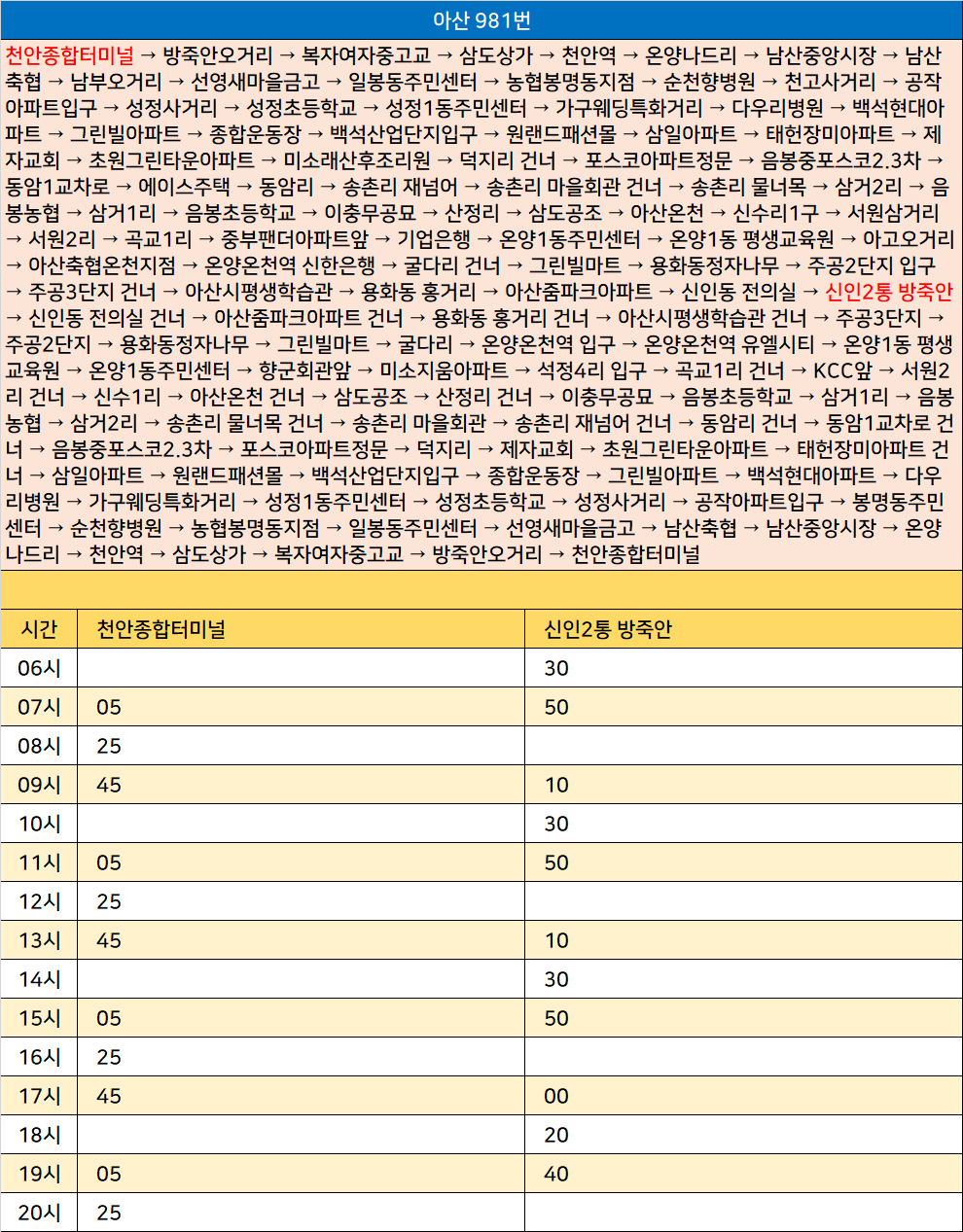아산 981번: 천안종합터미널 → 방죽안오거리 → 복자여자중고교 → 삼도상가 → 천안역 → 온양나드리 → 남산중앙시장 → 남산축협 → 남부오거리 → 선영새마을금고 → 일봉동주민센터 → 농협봉명동지점 → 순천향병원 → 천고사거리 → 공작아파트입구 → 성정사거리 → 성정초등학교 → 성정1동주민센터 → 가구웨딩특화거리 → 다우리병원 → 백석현대아파트 → 그린빌아파트 → 종합운동장 → 백석산업단지입구 → 원랜드패션몰 → 삼일아파트 → 태헌장미아파트 → 제자교회 → 초원그린타운아파트 → 미소래산후조리원 → 덕지리 건너 → 포스코아파트정문 → 음봉중포스코2.3차 → 동암1교차로 → 에이스주택 → 동암리 → 송촌리 재넘어 → 송촌리 마을회관 건너 → 송촌리 물너목 → 삼거2리 → 음봉농협 → 삼거1리 → 음봉초등학교 → 이충무공묘 → 산정리 → 삼도공조 → 아산온천 → 신수리1구 → 서원삼거리 → 서원2리 → 곡교1리 → 중부팬더아파트앞 → 기업은행 → 온양1동주민센터 → 온양1동 평생교육원 → 아고오거리 → 아산축협온천지점 → 온양온천역 신한은행 → 굴다리 건너 → 그린빌마트 → 용화동정자나무 → 주공2단지 입구 → 주공3단지 건너 → 아산시평생학습관 → 용화동 홍거리 → 아산줌파크아파트 → 신인동 전의실 → 신인2통 방죽안 → 신인동 전의실 건너 → 아산줌파크아파트 건너 → 용화동 홍거리 건너 → 아산시평생학습관 건너 → 주공3단지 → 주공2단지 → 용화동정자나무 → 그린빌마트 → 굴다리 → 온양온천역 입구 → 온양온천역 유엘시티 → 온양1동 평생교육원 → 온양1동주민센터 → 향군회관앞 → 미소지움아파트 → 석정4리 입구 → 곡교1리 건너 → KCC앞 → 서원2리 건너 → 신수1리 → 아산온천 건너 → 삼도공조 → 산정리 건너 → 이충무공묘 → 음봉초등학교 → 삼거1리 → 음봉농협 → 삼거2리 → 송촌리 물너목 건너 → 송촌리 마을회관 → 송촌리 재넘어 건너 → 동암리 건너 → 동암1교차로 건너 → 음봉중포스코2.3차 → 포스코아파트정문 → 덕지리 → 제자교회 → 초원그린타운아파트 → 태헌장미아파트 건너 → 삼일아파트 → 원랜드패션몰 → 백석산업단지입구 → 종합운동장 → 그린빌아파트 → 백석현대아파트 → 다우리병원 → 가구웨딩특화거리 → 성정1동주민센터 → 성정초등학교 → 성정사거리 → 공작아파트입구 → 봉명동주민센터 → 순천향병원 → 농협봉명동지점 → 일봉동주민센터 → 선영새마을금고 → 남산축협 → 남산중앙시장 → 온양나드리 → 천안역 → 삼도상가 → 복자여자중고교 → 방죽안오거리 → 천안종합터미널