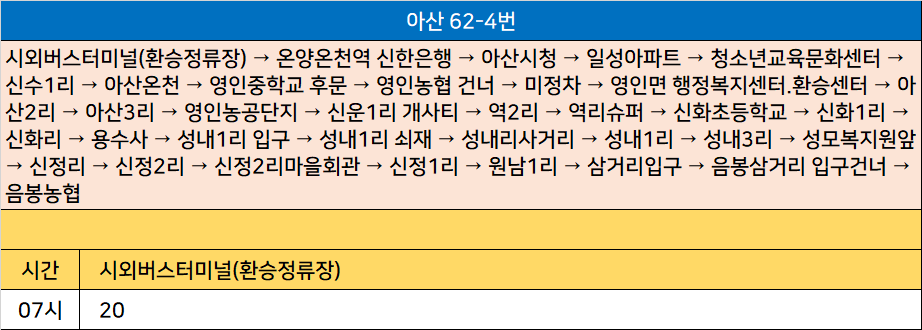 아산 62-4번: 시외버스터미널(환승정류장) → 온양온천역 신한은행 → 아산시청 → 일성아파트 → 청소년교육문화센터 → 신수1리 → 아산온천 → 영인중학교 후문 → 영인농협 건너 → 영인면 행정복지센터.환승센터 → 아산2리 → 아산3리 → 영인농공단지 → 신운1리 개사티 → 역2리 → 역리슈퍼 → 신화초등학교 → 신화1리 → 신화리 → 용수사 → 성내1리 입구 → 성내1리 쇠재 → 성내리사거리 → 성내1리 → 성내3리 → 성모복지원앞 → 신정리 → 신정2리 → 신정2리마을회관 → 신정1리 → 원남1리 → 삼거리입구 → 음봉삼거리 입구건너 → 음봉농협