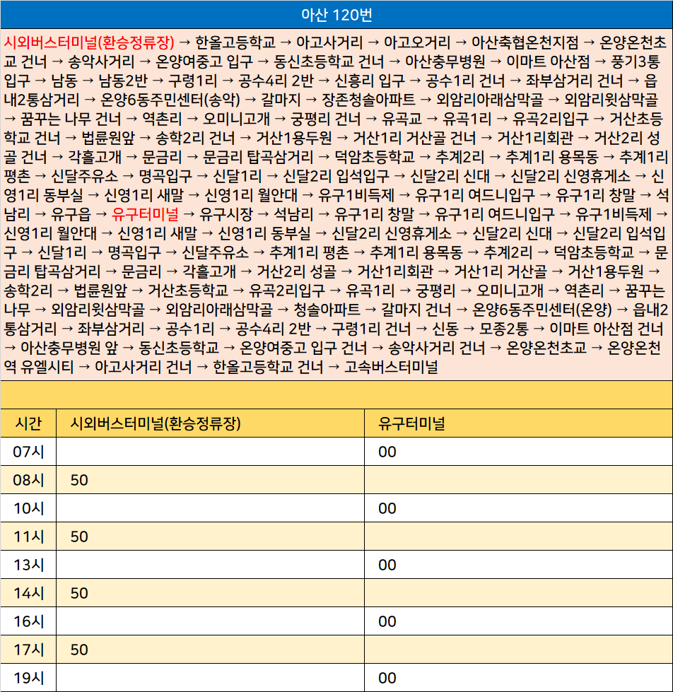 아산 120번: 시외버스터미널(환승정류장) → 한올고등학교 → 아고사거리 → 아고오거리 → 아산축협온천지점 → 온양온천초교 건너 → 송악사거리 → 온양여중고 입구 → 동신초등학교 건너 → 아산충무병원 → 이마트 아산점 → 풍기3통 입구 → 남동 → 남동2반 → 구령1리 → 공수4리 2반 → 신흥리 입구 → 공수1리 건너 → 좌부삼거리 건너 → 읍내2통삼거리 → 온양6동주민센터(송악) → 갈마지 → 장존청솔아파트 → 외암리아래삼막골 → 외암리윗삼막골 → 꿈꾸는 나무 건너 → 역촌리 → 오미니고개 → 궁평리 건너 → 유곡교 → 유곡1리 → 유곡2리입구 → 거산초등학교 건너 → 법륜원앞 → 송학2리 건너 → 거산1용두원 → 거산1리 거산골 건너 → 거산1리회관 → 거산2리 성골 건너 → 각흘고개 → 문금리 → 문금리 탑곡삼거리 → 덕암초등학교 → 추계2리 → 추계1리 용목동 → 추계1리 평촌 → 신달주유소 → 명곡입구 → 신달1리 → 신달2리 입석입구 → 신달2리 신대 → 신달2리 신영휴게소 → 신영1리 동부실 → 신영1리 새말 → 신영1리 월안대 → 유구1비득제 → 유구1리 여드니입구 → 유구1리 창말 → 석남리 → 유구읍 → 유구터미널 → 유구시장 → 석남리 → 유구1리 창말 → 유구1리 여드니입구 → 유구1비득제 → 신영1리 월안대 → 신영1리 새말 → 신영1리 동부실 → 신달2리 신영휴게소 → 신달2리 신대 → 신달2리 입석입구 → 신달1리 → 명곡입구 → 신달주유소 → 추계1리 평촌 → 추계1리 용목동 → 추계2리 → 덕암초등학교 → 문금리 탑곡삼거리 → 문금리 → 각흘고개 → 거산2리 성골 → 거산1리회관 → 거산1리 거산골 → 거산1용두원 → 송학2리 → 법륜원앞 → 거산초등학교 → 유곡2리입구 → 유곡1리 → 궁평리 → 오미니고개 → 역촌리 → 꿈꾸는 나무 → 외암리윗삼막골 → 외암리아래삼막골 → 청솔아파트 → 갈마지 건너 → 온양6동주민센터(온양) → 읍내2통삼거리 → 좌부삼거리 → 공수1리 → 공수4리 2반 → 구령1리 건너 → 신동 → 모종2통 → 이마트 아산점 건너 → 아산충무병원 앞 → 동신초등학교 → 온양여중고 입구 건너 → 송악사거리 건너 → 온양온천초교 → 온양온천역 유엘시티 → 아고사거리 건너 → 한올고등학교 건너 → 고속버스터미널