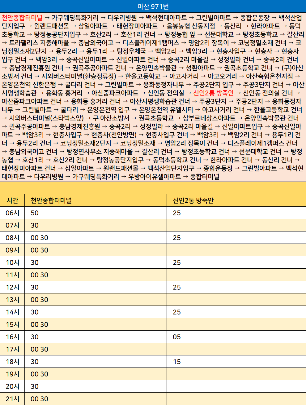 아산 971번: 천안종합터미널 → 가구웨딩특화거리 → 다우리병원 → 백석현대아파트 → 그린빌아파트 → 종합운동장 → 백석산업단지입구 → 원랜드패션몰 → 삼일아파트 → 태헌장미아파트 → 음봉농협 산동지점 → 동산리 → 한라아파트 → 동덕초등학교 → 탕정농공단지입구 → 호산2리 → 호산1리 건너 → 탕정농협 앞 → 선문대학교 → 탕정초등학교 → 갈산리 → 트라팰리스 지중해마을 → 충남외국어고 → 디스플레이제1캠퍼스 → 명암2리 장목이 → 코닝정밀소재 건너 → 코닝정밀소재2단지 → 용두2리 → 용두1리 → 탕정우체국 → 백암2리 → 백암3리 → 현충사입구 → 현충사 → 현충사입구 건너 → 백암3리 → 송곡신일아파트 → 신일아파트 건너 → 송곡2리 마을길 → 성정빌라 건너 → 송곡2리 건너 → 충남경제진흥원 건너 → 권곡주공아파트 건너 → 온양민속박물관 → 성환아파트 → 권곡초등학교 건너 → (구)아산소방서 건너 → 시외버스터미널(환승정류장) → 한올고등학교 → 아고사거리 → 아고오거리 → 아산축협온천지점 → 온양온천역 신한은행 → 굴다리 건너 → 그린빌마트 → 용화동정자나무 → 주공2단지 입구 → 주공3단지 건너 → 아산시평생학습관 → 용화동 홍거리 → 아산줌파크아파트 → 신인동 전의실 → 신인2통 방죽안 → 신인동 전의실 건너 → 아산줌파크아파트 건너 → 용화동 홍거리 건너 → 아산시평생학습관 건너 → 주공3단지 → 주공2단지 → 용화동정자나무 → 그린빌마트 → 굴다리 → 온양온천역 입구 → 온양온천역 유엘시티 → 아고사거리 건너 → 한올고등학교 건너 → 시외버스터미널(스타벅스앞) → 구 아산소방서 → 권곡초등학교 → 삼부르네상스아파트 → 온양민속박물관 건너 → 권곡주공아파트 → 충남경제진흥원 → 송곡2리 → 성정빌라 → 송곡2리 마을길 → 신일아파트입구 → 송곡신일아파트 → 백암3리 → 현충사입구 → 현충사(천안방면) → 현충사입구 건너 → 백암3리 → 백암2리 건너 → 용두1리 건너 → 용두2리 건너 → 코닝정밀소재2단지 → 코닝정밀소재 → 명암2리 장목이 건너 → 디스플레이제1캠퍼스 건너 → 충남외국어고 건너 → 탕정면사무소 지중해마을 → 갈산리 건너 → 탕정초등학교 건너 → 선문대학교 건너 → 탕정농협 → 호산1리 → 호산2리 건너 → 탕정농공단지입구 → 동덕초등학교 건너 → 한라아파트 건너 → 동산리 건너 → 태헌장미아파트 건너 → 삼일아파트 → 원랜드패션몰 → 백석산업단지입구 → 종합운동장 → 그린빌아파트 → 백석현대아파트 → 다우리병원 → 가구웨딩특화거리 → 우방아이유셀아파트 → 천안종합터미널