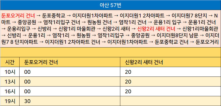 아산 57번: 둔포오거리 건너 → 둔포중학교 → 이지더원1차아파트 → 이지더원1 2차아파트 → 이지더원7 8단지 → N마트 → 중앙공원 → 염작1리입구 건너 → 원농원 건너 → 염작1리 건너 → 운용1리 입구 → 운용1리 건너 → 운용리입구 → 신방리 → 신왕1리 마을회관 → 신왕2리 새터 → 신왕2리 새터 건너 → 신왕1리마을회관 → 신방리 → 운용1리 → 염작1리 → 원농원 → 염작1리입구 → 중앙공원 → 이지더원8단지 남문 → 이지더원7 8 단지아파트 → 이지더원1 2차아파트 건너 → 이지더원1차아파트 → 둔포중학교 건너 → 둔포오거리