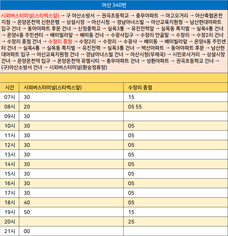 아산 340번: 시외버스터미널(스타벅스앞) → 구 아산소방서 → 권곡초등학교 → 충무아파트 → 아고오거리 → 아산축협온천지점 → 온양온천역 신한은행 → 상설시장 → 아산시청 → 경남아너스빌 → 아산교육지원청 → 남산현대아파트 입구 건너 → 동아아파트 후문 건너 → 신정중학교 → 실옥3통 → 유진전력앞 → 실옥동 쪽지벌 → 실옥4통 건너 → 온양4동 주민센터 → 배미빌라앞 → 배미동 건너 → 수광사입구 → 수장리 안골말 → 수장리 → 수장2리 건너 → 수장리 종점 건너 → 수장리 종점 → 수장2리 → 수장리 → 수광사 → 배미동 → 배미빌라앞 → 온양4동 주민센터 건너 → 실옥4통 → 실옥동 쪽지벌 → 유진전력 → 실옥3통 건너 → 벽산아파트 → 동아아파트 후문 → 남산현대아파트 입구 → 아산교육지원청 건너 → 경남아너스빌 건너 → 아산시청(우체국) → 시민로사거리 → 상설시장 건너 → 온양온천역 입구 → 온양온천역 유엘시티 → 충무아파트 건너 → 성환아파트 → 권곡초등학교 건너 → (구)아산소방서 건너 → 시외버스터미널(환승정류장)