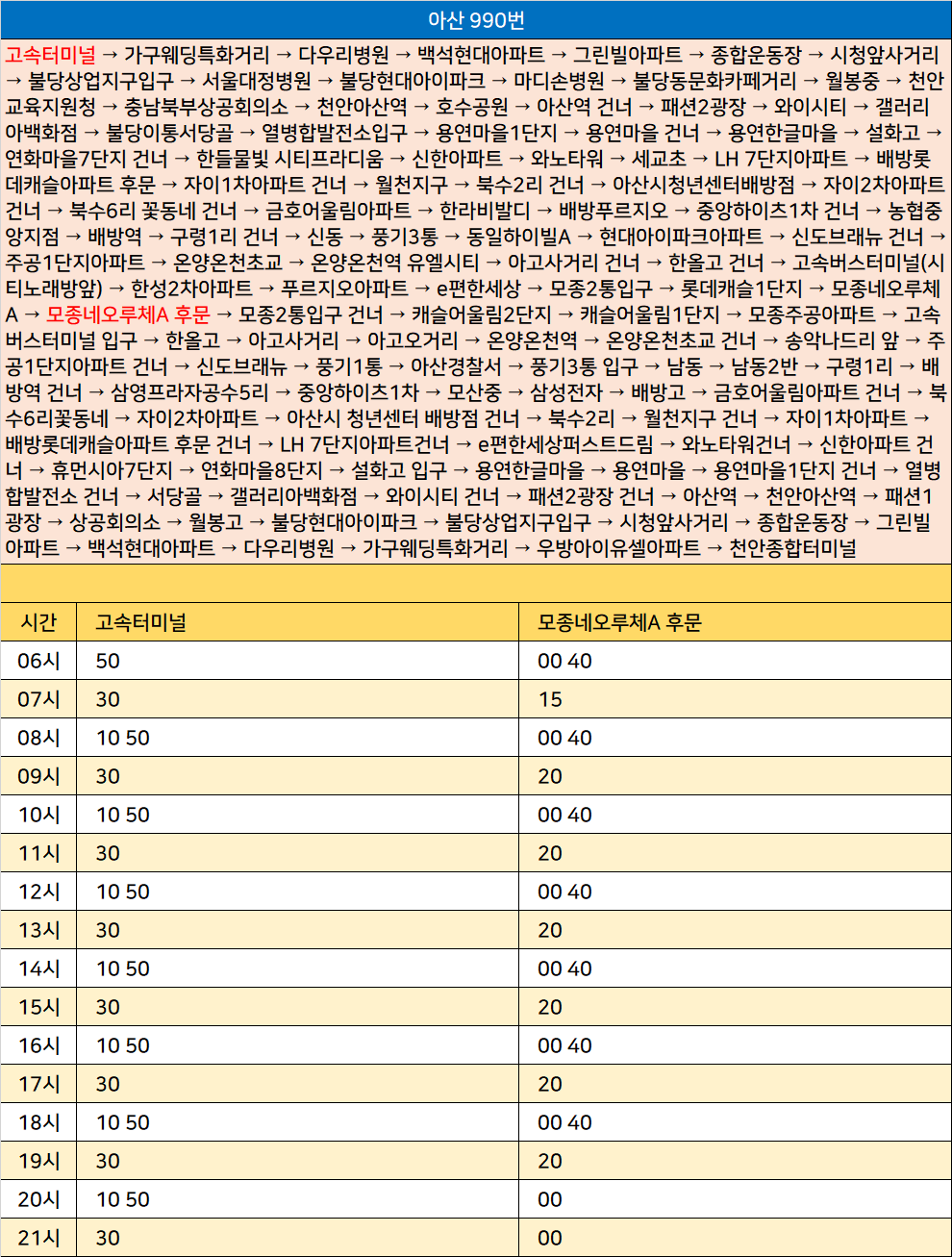 아산 990번: 고속터미널 → 가구웨딩특화거리 → 다우리병원 → 백석현대아파트 → 그린빌아파트 → 종합운동장 → 시청앞사거리 → 불당상업지구입구 → 서울대정병원 → 불당현대아이파크 → 마디손병원 → 불당동문화카페거리 → 월봉중학교 → 천안교육지원청 → 충남북부상공회의소 → 천안아산역 → 호수공원 → 아산역 건너 → 패션2광장 → 와이시티 → 갤러리아백화점 → 불당이통서당골 → 열병합발전소입구 → 용연마을1단지 → 용연마을 건너 → 용연한글마을 → 설화고등학교 → 연화마을7단지 건너 → 한들물빛 시티프라디움 → 신한아파트 → 와노타워 → 세교초등학교 → LH 7단지아파트 → 배방롯데캐슬아파트 후문 → 자이1차아파트 건너 → 월천지구 → 북수2리 건너 → 아산시청년센터배방점 → 자이2차아파트 건너 → 북수6리 꽃동네 건너 → 금호어울림아파트 → 한라비발디 → 배방푸르지오 → 중앙하이츠1차 건너 → 농협중앙지점 → 배방역 → 구령1리 건너 → 신동 → 풍기3통 → 동일하이빌A → 현대아이파크아파트 → 신도브래뉴 건너 → 주공1단지아파트 → 온양온천초교 → 온양온천역 유엘시티 → 아고사거리 건너 → 한올고등학교 건너 → 고속버스터미널(시티노래방앞) → 한성2차아파트 → 푸르지오아파트 → e편한세상 → 모종2통입구 → 롯데캐슬1단지 → 모종네오루체 A → 모종네오루체A 후문 → 모종2통입구 건너 → 캐슬어울림2단지 → 캐슬어울림1단지 → 모종주공아파트 → 고속버스터미널 입구 → 한올고등학교 → 아고사거리 → 아고오거리 → 온양온천역 → 온양온천초교 건너 → 송악나드리 앞 → 주공1단지아파트 건너 → 신도브래뉴 → 풍기1통 → 아산경찰서 → 풍기3통 입구 → 남동 → 남동2반 → 구령1리 → 배방역 건너 → 삼영프라자공수5리 → 중앙하이츠1차 → 모산중학교 → 삼성전자 → 배방고등학교 → 금호어울림아파트 건너 → 북수6리꽃동네 → 자이2차아파트 → 아산시 청년센터 배방점 건너 → 북수2리 → 월천지구 건너 → 자이1차아파트 → 배방롯데캐슬아파트 후문 건너 → LH 7단지아파트건너 → e편한세상퍼스트드림 → 와노타워건너 → 신한아파트 건너 → 휴먼시아7단지 → 연화마을8단지 → 설화고등학교 입구 → 용연한글마을 → 용연마을 → 용연마을1단지 건너 → 열병합발전소 건너 → 서당골 → 갤러리아백화점 → 와이시티 건너 → 패션2광장 건너 → 아산역 → 천안아산역 → 패션1광장 → 상공회의소 → 월봉고등학교 → 불당현대아이파크 → 불당상업지구입구 → 시청앞사거리 → 종합운동장 → 그린빌아파트 → 백석현대아파트 → 다우리병원 → 가구웨딩특화거리 → 우방아이유셀아파트 → 천안종합터미널