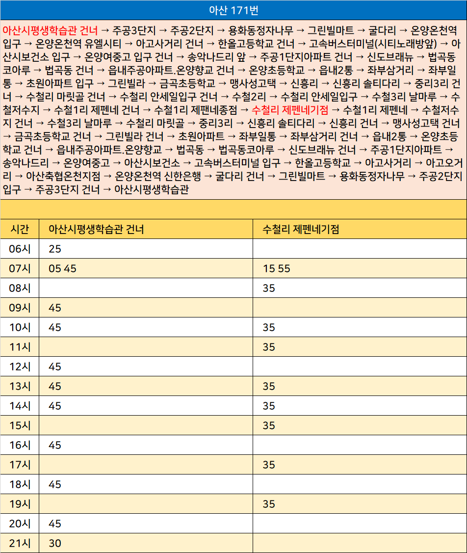 아산 171번: 아산시평생학습관 건너 → 주공3단지 → 주공2단지 → 용화동정자나무 → 그린빌마트 → 굴다리 → 온양온천역 입구 → 온양온천역 유엘시티 → 아고사거리 건너 → 한올고등학교 건너 → 고속버스터미널(시티노래방앞) → 아산시보건소 입구 → 온양여중고 입구 건너 → 송악나드리 앞 → 주공1단지아파트 건너 → 신도브래뉴 → 법곡동코아루 → 법곡동 건너 → 읍내주공아파트.온양향교 건너 → 온양초등학교 → 읍내2통 → 좌부삼거리 → 좌부일통 → 초원아파트 입구 → 그린빌라 → 금곡초등학교 → 맹사성고택 → 신흥리 → 신흥리 솔티다리 → 중리3리 건너 → 수철리 마릿골 건너 → 수철리 안세일입구 건너 → 수철2리 → 수철리 안세일입구 → 수철3리 날마루 → 수철저수지 → 수철1리 제펜네 건너 → 수철1리 제팬네종점 → 수철리 제펜네기점 → 수철1리 제펜네 → 수철저수지 건너 → 수철3리 날마루 → 수철리 마릿골 → 중리3리 → 신흥리 솔티다리 → 신흥리 건너 → 맹사성고택 건너 → 금곡초등학교 건너 → 그린빌라 건너 → 초원아파트 → 좌부일통 → 좌부삼거리 건너 → 읍내2통 → 온양초등학교 건너 → 읍내주공아파트.온양향교 → 법곡동 → 법곡동코아루 → 신도브래뉴 건너 → 주공1단지아파트 → 송악나드리 → 온양여중고 → 아산시보건소 → 고속버스터미널 입구 → 한올고등학교 → 아고사거리 → 아고오거리 → 아산축협온천지점 → 온양온천역 신한은행 → 굴다리 건너 → 그린빌마트 → 용화동정자나무 → 주공2단지 입구 → 주공3단지 건너 → 아산시평생학습관