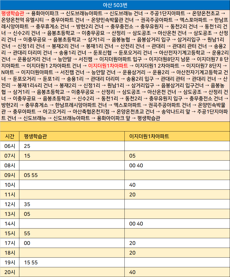 아산 503번: 평생학습관 → 용화아이파크 → 신도브래뉴아파트 → 신도브래뉴 건너 → 주공1단지아파트 → 온양온천초교 → 온양온천역 유엘시티 → 충무아파트 건너 → 온양민속박물관 건너 → 권곡주공아파트 → 엑스포아파트 → 한남프레시앙아파트 → 충무휴게소 건너 → 방현2리 건너 → 충무충전소 → 충무유원지 → 동천2리 건너 → 동천1리 건너 → 신수2리 건너 → 음봉초등학교 → 이충무공묘 → 산정리 → 삼도공조 → 아산온천 건너 → 삼도공조 → 산정리 건너 → 이충무공묘 → 음봉초등학교 → 삼거1리 → 음봉농협 → 음봉삼거리 입구 → 삼거리입구 → 원남1리 건너 → 신정1리 건너 → 봉재2리 건너 → 봉재1리 건너 → 산전리 건너 → 관대리 → 관대리 관터 건너 → 송용2리 → 관대리 더리미 건너 → 송용1리 건너 → 둔포신협 → 둔포오거리 건너 → 아산전자기계고등학교 → 운용2리 건너 → 운용삼거리 건너 → 능안말 → 서진캠 → 이지더원아파트 입구 → 이지더원8단지 남문 → 이지더원7 8 단지아파트 → 이지더원1 2차아파트 건너 → 이지더원1차아파트 → 이지더원1 2차아파트 → 이지더원7 8단지 → N마트 → 이지더원아파트 → 서진캠 건너 → 능안말 건너 → 운용삼거리 → 운용2리 → 아산전자기계고등학교 건너 → 둔포오거리 → 둔포1리 → 송용1리 → 관대리 더리미 → 송용2리 입구 → 관대리 관터 → 관대리 건너 → 산전리 → 봉재1리4리 건너 → 봉재2리 → 신정1리 → 원남1리 → 삼거리입구 → 음봉삼거리 입구건너 → 음봉농협 → 삼거1리 → 음봉초등학교 → 이충무공묘 → 산정리 → 삼도공조 → 아산온천 건너 → 삼도공조 → 산정리 건너 → 이충무공묘 → 음봉초등학교 → 신수2리 → 동천1리 → 동천2리 → 충무유원지 입구 → 충무충전소 건너 → 방현2리 → 충무휴게소 → 한남프레시앙아파트 건너 → 엑스포아파트 → 권곡주공아파트 건너 → 온양민속박물관 → 충무아파트 → 아고오거리 → 아산축협온천지점 → 온양온천초교 건너 → 송악나드리 앞 → 주공1단지아파트 건너 → 신도브래뉴 → 신도브래뉴아파트 → 용화아이파크 앞 → 평생학습관