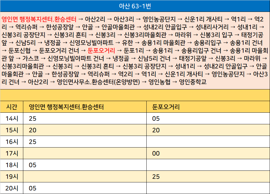 아산 63-1번: 영인면 행정복지센터.환승센터 → 아산2리 → 아산3리 → 영인농공단지 → 신운1리 개사티 → 역1리 → 역2리 → 역리슈퍼 → 한성공장앞 → 안골 → 안골마을회관 → 성내2리 안골입구 → 성내리사거리 → 성내1리 → 신봉3리 공장단지 → 신봉3리 흔티 → 신봉3리 → 신봉3리마을회관 → 마라위 → 신봉3리 입구 → 태정기공앞 → 신남5리 → 냉정골 → 신영모닝빌아파트 → 유한 → 송용1리 마을회관 → 송용리입구 → 송용1리 건너 → 둔포신협 → 둔포오거리 건너 → 둔포오거리 → 둔포1리 → 송용1리 → 송용리입구 건너 → 송용1리 마을회관 앞 → 가스코 → 신영모닝빌아파트 건너 → 냉정골 → 신남5리 건너 → 태정기공앞 → 신봉3리 → 마라위 → 신봉3리마을회관 → 신봉3리 → 신봉3리 흔티 → 신봉3리 공장단지 → 성내1리 → 성내2리 안골입구 → 안골마을회관 → 안골 → 한성공장앞 → 역리슈퍼 → 역2리 → 역1리 → 신운1리 개사티 → 영인농공단지 → 아산3리 건너 → 아산2리 → 영인면사무소.환승센터(온양방면) → 영인농협 → 영인중학교