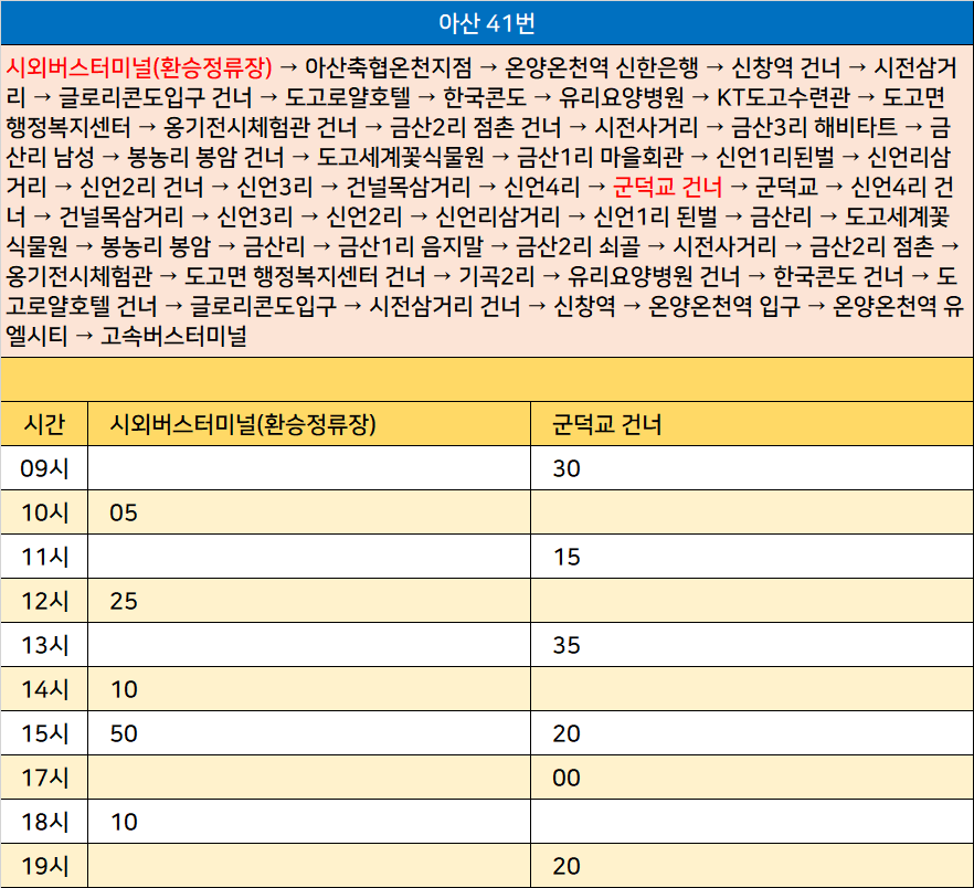 아산 41번: 시외버스터미널(환승정류장) → 아산축협온천지점 → 온양온천역 신한은행 → 신창역 건너 → 시전삼거리 → 글로리콘도입구 건너 → 도고로얄호텔 → 한국콘도 → 유리요양병원 → KT도고수련관 → 도고면 행정복지센터 → 옹기전시체험관 건너 → 금산2리 점촌 건너 → 시전사거리 → 금산3리 해비타트 → 금산리 남성 → 봉농리 봉암 건너 → 도고세계꽃식물원 → 금산1리 마을회관 → 신언1리된벌 → 신언리삼거리 → 신언2리 건너 → 신언3리 → 건널목삼거리 → 신언4리 → 군덕교 건너 → 군덕교 → 신언4리 건너 → 건널목삼거리 → 신언3리 → 신언2리 → 신언리삼거리 → 신언1리 된벌 → 금산리 → 도고세계꽃식물원 → 봉농리 봉암 → 금산리 → 금산1리 음지말 → 금산2리 쇠골 → 시전사거리 → 금산2리 점촌 → 옹기전시체험관 → 도고면 행정복지센터 건너 → 기곡2리 → 유리요양병원 건너 → 한국콘도 건너 → 도고로얄호텔 건너 → 글로리콘도입구 → 시전삼거리 건너 → 신창역 → 온양온천역 입구 → 온양온천역 유엘시티 → 고속버스터미널
