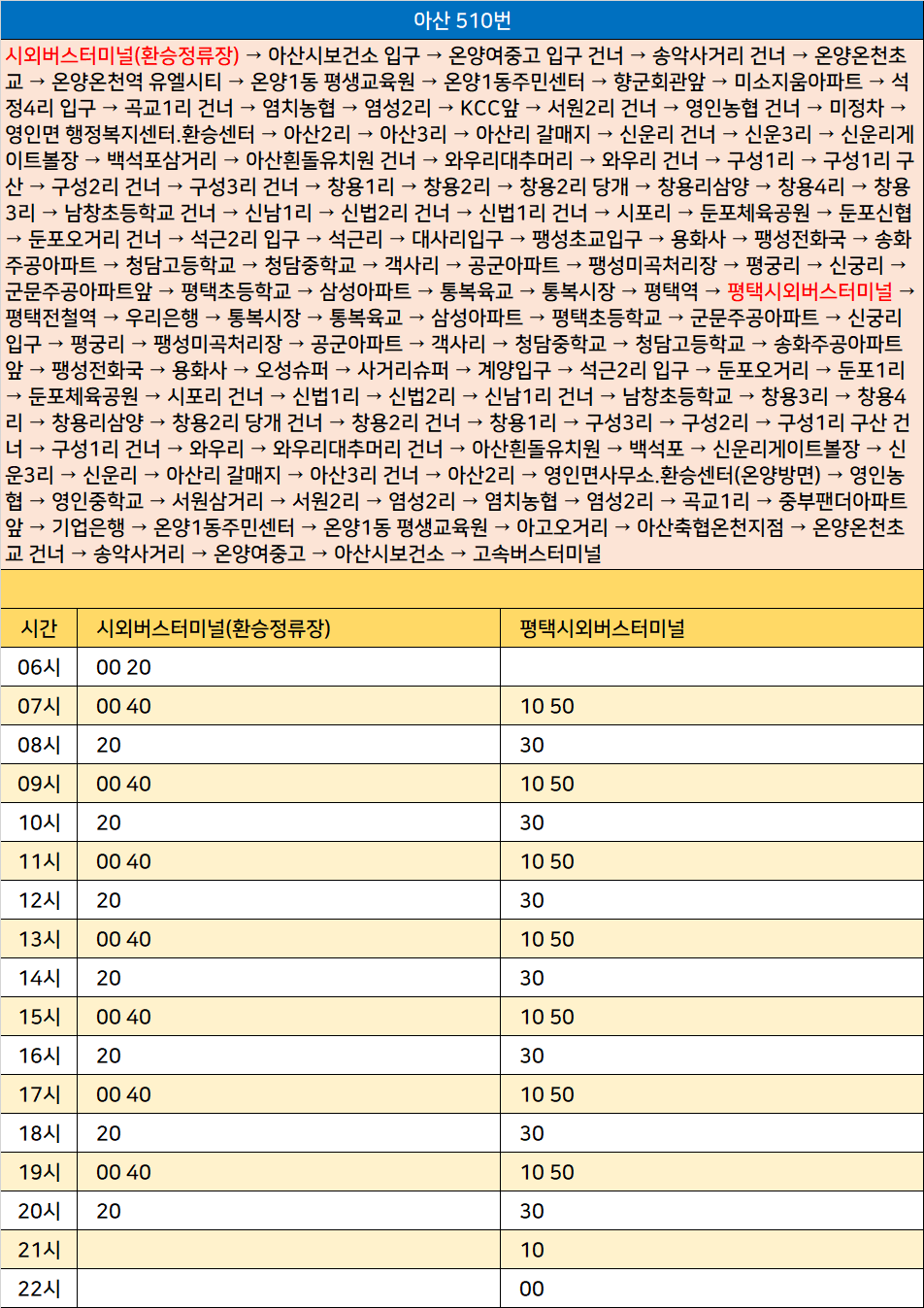 아산 510번: 시외버스터미널(환승정류장) → 아산시보건소 입구 → 온양여중고 입구 건너 → 송악사거리 건너 → 온양온천초교 → 온양온천역 유엘시티 → 온양1동 평생교육원 → 온양1동주민센터 → 향군회관앞 → 미소지움아파트 → 석정4리 입구 → 곡교1리 건너 → 염치농협 → 염성2리 → KCC앞 → 서원2리 건너 → 영인농협 건너 → 영인면 행정복지센터.환승센터 → 아산2리 → 아산3리 → 아산리 갈매지 → 신운리 건너 → 신운3리 → 신운리게이트볼장 → 백석포삼거리 → 아산흰돌유치원 건너 → 와우리대추머리 → 와우리 건너 → 구성1리 → 구성1리 구산 → 구성2리 건너 → 구성3리 건너 → 창용1리 → 창용2리 → 창용2리 당개 → 창용리삼양 → 창용4리 → 창용3리 → 남창초등학교 건너 → 신남1리 → 신법2리 건너 → 신법1리 건너 → 시포리 → 둔포체육공원 → 둔포신협 → 둔포오거리 건너 → 석근2리 입구 → 석근리 → 대사리입구 → 팽성초교입구 → 용화사 → 팽성전화국 → 송화주공아파트 → 청담고등학교 → 청담중학교 → 객사리 → 공군아파트 → 팽성미곡처리장 → 평궁리 → 신궁리 → 군문주공아파트앞 → 평택초등학교 → 삼성아파트 → 통복육교 → 통복시장 → 평택역 → 평택시외버스터미널 → 평택전철역 → 우리은행 → 통복시장 → 통복육교 → 삼성아파트 → 평택초등학교 → 군문주공아파트 → 신궁리 입구 → 평궁리 → 팽성미곡처리장 → 공군아파트 → 객사리 → 청담중학교 → 청담고등학교 → 송화주공아파트앞 → 팽성전화국 → 용화사 → 오성슈퍼 → 사거리슈퍼 → 계양입구 → 석근2리 입구 → 둔포오거리 → 둔포1리 → 둔포체육공원 → 시포리 건너 → 신법1리 → 신법2리 → 신남1리 건너 → 남창초등학교 → 창용3리 → 창용4리 → 창용리삼양 → 창용2리 당개 건너 → 창용2리 건너 → 창용1리 → 구성3리 → 구성2리 → 구성1리 구산 건너 → 구성1리 건너 → 와우리 → 와우리대추머리 건너 → 아산흰돌유치원 → 백석포 → 신운리게이트볼장 → 신운3리 → 신운리 → 아산리 갈매지 → 아산3리 건너 → 아산2리 → 영인면사무소.환승센터(온양방면) → 영인농협 → 영인중학교 → 서원삼거리 → 서원2리 → 염성2리 → 염치농협 → 염성2리 → 곡교1리 → 중부팬더아파트앞 → 기업은행 → 온양1동주민센터 → 온양1동 평생교육원 → 아고오거리 → 아산축협온천지점 → 온양온천초교 건너 → 송악사거리 → 온양여중고 → 아산시보건소 → 고속버스터미널