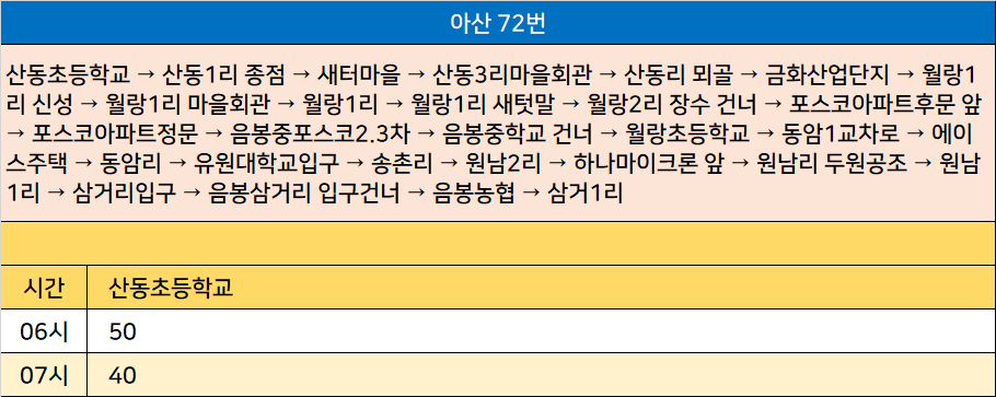아산 72번: 산동초등학교 → 산동1리 종점 → 새터마을 → 산동3리마을회관 → 산동리 뫼골 → 금화산업단지 → 월랑1리 신성 → 월랑1리 마을회관 → 월랑1리 → 월랑1리 새텃말 → 월랑2리 장수 건너 → 포스코아파트후문 앞 → 포스코아파트정문 → 음봉중포스코2.3차 → 음봉중학교 건너 → 월랑초등학교 → 동암1교차로 → 에이스주택 → 동암리 → 유원대학교입구 → 송촌리 → 원남2리 → 하나마이크론 앞 → 원남리 두원공조 → 원남1리 → 삼거리입구 → 음봉삼거리 입구건너 → 음봉농협 → 삼거1리