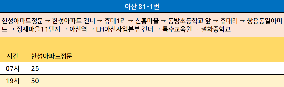 아산 81-1번: 한성아파트정문 → 한성아파트 건너 → 휴대1리 → 신흥마을 → 동방초등학교 앞 → 휴대리 → 쌍용동일아파트 → 장재마을11단지 → 아산역 → LH아산사업본부 건너 → 특수교육원 → 설화중학교