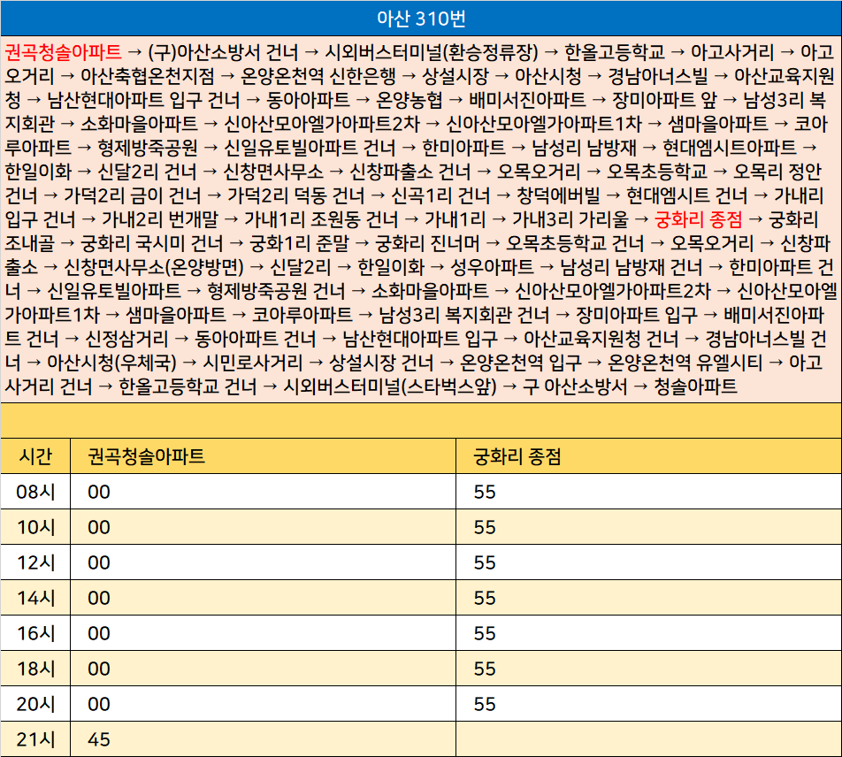 아산 310번: 권곡청솔아파트 → (구)아산소방서 건너 → 시외버스터미널(환승정류장) → 한올고등학교 → 아고사거리 → 아고오거리 → 아산축협온천지점 → 온양온천역 신한은행 → 상설시장 → 아산시청 → 경남아너스빌 → 아산교육지원청 → 남산현대아파트 입구 건너 → 동아아파트 → 온양농협 → 배미서진아파트 → 장미아파트 앞 → 남성3리 복지회관 → 소화마을아파트 → 신아산모아엘가아파트2차 → 신아산모아엘가아파트1차 → 샘마을아파트 → 코아루아파트 → 형제방죽공원 → 신일유토빌아파트 건너 → 한미아파트 → 남성리 남방재 → 현대엠시트아파트 → 한일이화 → 신달2리 건너 → 신창면사무소 → 신창파출소 건너 → 오목오거리 → 오목초등학교 → 오목리 정안 건너 → 가덕2리 금이 건너 → 가덕2리 덕동 건너 → 신곡1리 건너 → 창덕에버빌 → 현대엠시트 건너 → 가내리입구 건너 → 가내2리 번개말 → 가내1리 조원동 건너 → 가내1리 → 가내3리 가리울 → 궁화리 종점 → 궁화리 조내골 → 궁화리 국시미 건너 → 궁화1리 준말 → 궁화리 진너머 → 오목초등학교 건너 → 오목오거리 → 신창파출소 → 신창면사무소(온양방면) → 신달2리 → 한일이화 → 성우아파트 → 남성리 남방재 건너 → 한미아파트 건너 → 신일유토빌아파트 → 형제방죽공원 건너 → 소화마을아파트 → 신아산모아엘가아파트2차 → 신아산모아엘가아파트1차 → 샘마을아파트 → 코아루아파트 → 남성3리 복지회관 건너 → 장미아파트 입구 → 배미서진아파트 건너 → 신정삼거리 → 동아아파트 건너 → 남산현대아파트 입구 → 아산교육지원청 건너 → 경남아너스빌 건너 → 아산시청(우체국) → 시민로사거리 → 상설시장 건너 → 온양온천역 입구 → 온양온천역 유엘시티 → 아고사거리 건너 → 한올고등학교 건너 → 시외버스터미널(스타벅스앞) → 구 아산소방서 → 청솔아파트