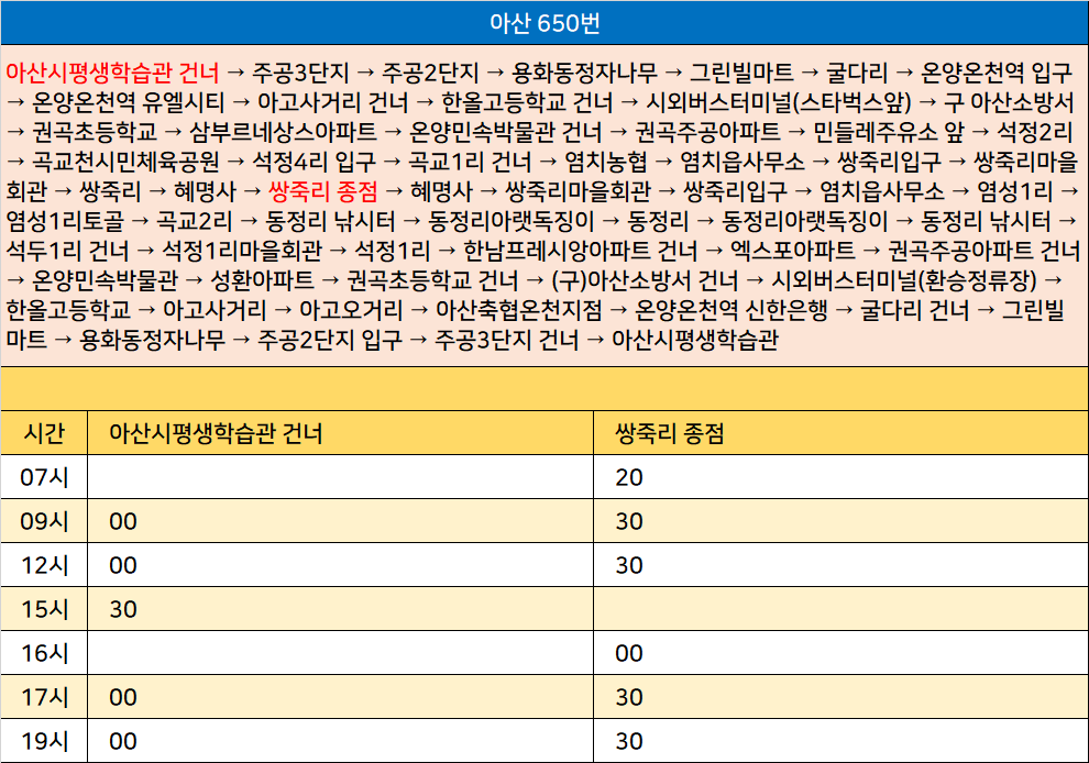 아산 650번: 아산시평생학습관 건너 → 주공3단지 → 주공2단지 → 용화동정자나무 → 그린빌마트 → 굴다리 → 온양온천역 입구 → 온양온천역 유엘시티 → 아고사거리 건너 → 한올고등학교 건너 → 시외버스터미널(스타벅스앞) → 구 아산소방서 → 권곡초등학교 → 삼부르네상스아파트 → 온양민속박물관 건너 → 권곡주공아파트 → 민들레주유소 앞 → 석정2리 → 곡교천시민체육공원 → 석정4리 입구 → 곡교1리 건너 → 염치농협 → 염치읍사무소 → 쌍죽리입구 → 쌍죽리마을회관 → 쌍죽리 → 혜명사 → 쌍죽리 종점 → 혜명사 → 쌍죽리마을회관 → 쌍죽리입구 → 염치읍사무소 → 염성1리 → 염성1리토골 → 곡교2리 → 동정리 낚시터 → 동정리아랫독징이 → 동정리 → 동정리아랫독징이 → 동정리 낚시터 → 석두1리 건너 → 석정1리마을회관 → 석정1리 → 한남프레시앙아파트 건너 → 엑스포아파트 → 권곡주공아파트 건너 → 온양민속박물관 → 성환아파트 → 권곡초등학교 건너 → (구)아산소방서 건너 → 시외버스터미널(환승정류장) → 한올고등학교 → 아고사거리 → 아고오거리 → 아산축협온천지점 → 온양온천역 신한은행 → 굴다리 건너 → 그린빌마트 → 용화동정자나무 → 주공2단지 입구 → 주공3단지 건너 → 아산시평생학습관