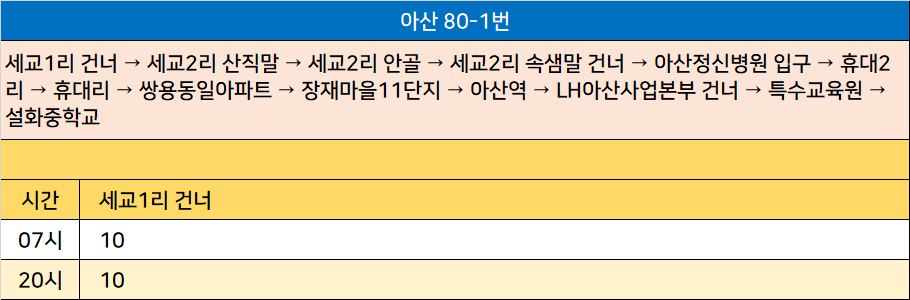 아산 80-1번: 세교1리 건너 → 세교2리 산직말 → 세교2리 안골 → 세교2리 속샘말 건너 → 아산정신병원 입구 → 휴대2리 → 휴대리 → 쌍용동일아파트 → 장재마을11단지 → 아산역 → LH아산사업본부 건너 → 특수교육원 → 설화중학교