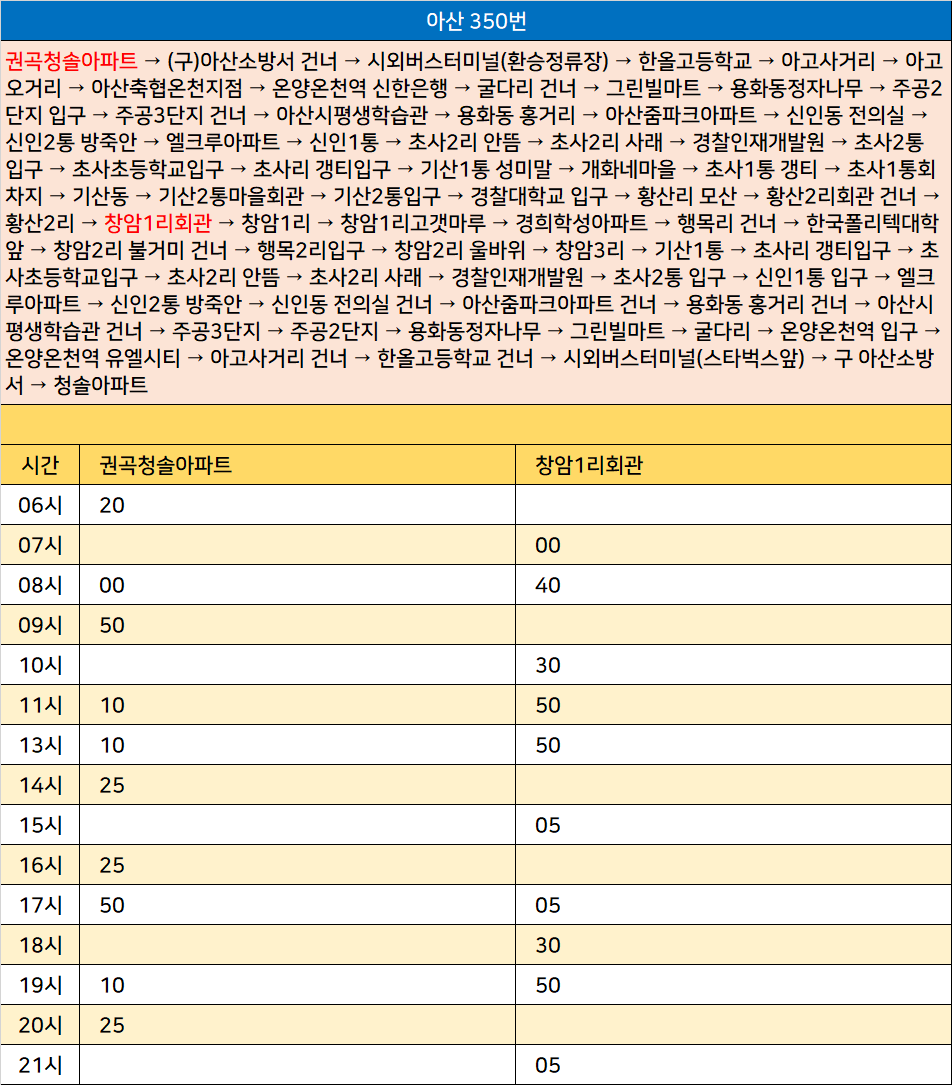 아산 350번: 권곡청솔아파트 → (구)아산소방서 건너 → 시외버스터미널(환승정류장) → 한올고등학교 → 아고사거리 → 아고오거리 → 아산축협온천지점 → 온양온천역 신한은행 → 굴다리 건너 → 그린빌마트 → 용화동정자나무 → 주공2단지 입구 → 주공3단지 건너 → 아산시평생학습관 → 용화동 홍거리 → 아산줌파크아파트 → 신인동 전의실 → 신인2통 방죽안 → 엘크루아파트 → 신인1통 → 초사2리 안뜸 → 초사2리 사래 → 경찰인재개발원 → 초사2통 입구 → 초사초등학교입구 → 초사리 갱티입구 → 기산1통 성미말 → 개화네마을 → 초사1통 갱티 → 초사1통회차지 → 기산동 → 기산2통마을회관 → 기산2통입구 → 경찰대학교 입구 → 황산리 모산 → 황산2리회관 건너 → 황산2리 → 창암1리회관 → 창암1리 → 창암1리고갯마루 → 경희학성아파트 → 행목리 건너 → 한국폴리텍대학앞 → 창암2리 불거미 건너 → 행목2리입구 → 창암2리 울바위 → 창암3리 → 기산1통 → 초사리 갱티입구 → 초사초등학교입구 → 초사2리 안뜸 → 초사2리 사래 → 경찰인재개발원 → 초사2통 입구 → 신인1통 입구 → 엘크루아파트 → 신인2통 방죽안 → 신인동 전의실 건너 → 아산줌파크아파트 건너 → 용화동 홍거리 건너 → 아산시평생학습관 건너 → 주공3단지 → 주공2단지 → 용화동정자나무 → 그린빌마트 → 굴다리 → 온양온천역 입구 → 온양온천역 유엘시티 → 아고사거리 건너 → 한올고등학교 건너 → 시외버스터미널(스타벅스앞) → 구 아산소방서 → 청솔아파트