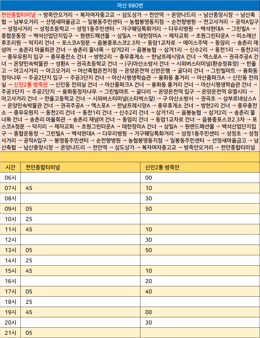 아산 980번: 천안종합터미널 → 방죽안오거리 → 복자여자중고교 → 삼도상가 → 천안역 → 온양나드리 → 남산중앙시장 → 남산축협 → 남부오거리 → 선영새마을금고 → 일봉동주민센터 → 농협봉명동지점 → 순천향병원 → 천고사거리 → 공작A입구 → 성정사거리 → 성정초등학교 → 성정1동주민센터 → 가구웨딩특화거리 → 다우리병원 → 백석현대A → 그린빌A → 종합운동장 → 백석산업단지입구 → 원랜드패션몰 → 삼일A → 태헌장미A → 제자교회 → 초원그린타운A → 미소래산후조리원 → 덕지리 건너 → 포스코A정문 → 음봉중포스코2.3차 → 동암1교차로 → 에이스주택 → 동암리 → 송촌리 재넘어 → 송촌리 마을회관 건너 → 송촌리 물너목 → 삼거2리 → 음봉농협 → 삼거1리 → 신수2리 → 동천1리 → 동천2리 → 충무유원지 입구 → 충무충전소 건너 → 방현2리 → 충무휴게소 → 한남프레시앙A 건너 → 엑스포A → 권곡주공A 건너 → 온양민속박물관 → 성환A → 권곡초등학교 건너 → (구)아산소방서 건너 → 시외버스터미널(환승정류장) → 한올고등학교 → 아고사거리 → 아고오거리 → 아산축협온천지점 → 온양온천역 신한은행 → 굴다리 건너 → 그린빌마트 → 용화동정자나무 → 주공2단지 입구 → 주공3단지 건너 → 아산시평생학습관 → 용화동 홍거리 → 아산줌파크A → 신인동 전의실 → 신인2통 방죽안 → 신인동 전의실 건너 → 아산줌파크A 건너 → 용화동 홍거리 건너 → 아산시평생학습관 건너 → 주공3단지 → 주공2단지 → 용화동정자나무 → 그린빌마트 → 굴다리 → 온양온천역 입구 → 온양온천역 유엘시티 → 아고사거리 건너 → 한올고등학교 건너 → 시외버스터미널(스타벅스앞) → 구 아산소방서 → 권곡초등학교 → 삼부르네상스A → 온양민속박물관 건너 → 권곡주공A → 엑스포A → 한남프레시앙A → 충무휴게소 건너 → 방현2리 건너 → 충무충전소 → 충무유원지 → 동천2리 건너 → 동천1리 건너 → 신수2리 건너 → 삼거1리 → 음봉농협 → 삼거2리 → 송촌리 물너목 건너 → 송촌리 마을회관 → 송촌리 재넘어 건너 → 동암리 건너 → 동암1교차로 건너 → 음봉중포스코2.3차 → 포스코A정문 → 덕지리 → 제자교회 → 초원그린타운A → 태헌장미A 건너 → 삼일A → 원랜드패션몰 → 백석산업단지입구 → 종합운동장 → 그린빌A → 백석현대A → 다우리병원 → 가구웨딩특화거리 → 성정1동주민센터 → 성정초등학교 → 성정사거리 → 공작A입구 → 봉명동주민센터 → 순천향병원 → 농협봉명동지점 → 일봉동주민센터 → 선영새마을금고 → 남산축협 → 남산중앙시장 → 온양나드리 → 천안역 → 삼도상가 → 복자여자중고교 → 방죽안오거리 → 천안종합터미널