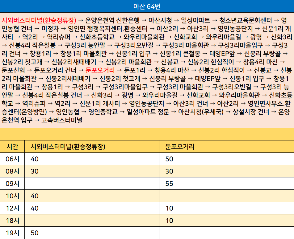 아산 64번: 시외버스터미널(환승정류장) → 온양온천역 신한은행 → 아산시청 → 일성아파트 → 청소년교육문화센터 → 영인농협 건너 → 영인면 행정복지센터.환승센터 → 아산2리 → 아산3리 → 영인농공단지 → 신운1리 개사티 → 역2리 → 역리슈퍼 → 신화초등학교 → 와우리마을회관 → 신화교회 → 와우리마을길 → 광명 → 신화3리 → 신봉4리 작은철봉 → 구성3리 능안말 → 구성3리오반길 → 구성3리 마을회관 → 구성3리마을입구 → 구성3리 건너 → 창용1리 → 창용1리 마을회관 → 신봉1리 입구 → 신봉1리 큰철봉 → 태양EP앞 → 신봉리 부랑골 → 신봉2리 첫고개 → 신봉2리새떼배기 → 신봉2리 마을회관 → 신봉교 → 신봉2리 한심직이 → 창용4리 마산 → 둔포신협 → 둔포오거리 건너 → 둔포오거리 → 둔포1리 → 창용4리 마산 → 신봉2리 한심직이 → 신봉교 → 신봉2리 마을회관 → 신봉2리새떼배기 → 신봉2리 첫고개 → 신봉리 부랑골 → 태양EP앞 → 신봉1리 입구 → 창용1리 마을회관 → 창용1리 → 구성3리 → 구성3리마을입구 → 구성3리 마을회관 → 구성3리오반길 → 구성3리 능안말 → 신봉4리 작은철봉 건너 → 신화3리 → 광명 → 와우리마을길 → 신화교회 → 와우리마을회관 → 신화초등학교 → 역리슈퍼 → 역2리 → 신운1리 개사티 → 영인농공단지 → 아산3리 건너 → 아산2리 → 영인면사무소.환승센터(온양방면) → 영인농협 → 영인중학교 → 일성아파트 정문 → 아산시청(우체국) → 상설시장 건너 → 온양온천역 입구 → 고속버스터미널