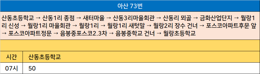 아산 73번: 산동초등학교 → 산동1리 종점 → 새터마을 → 산동3리마을회관 → 산동리 뫼골 → 금화산업단지 → 월랑1리 신성 → 월랑1리 마을회관 → 월랑1리 → 월랑1리 새텃말 → 월랑2리 장수 건너 → 포스코아파트후문 앞 → 포스코아파트정문 → 음봉중포스코2.3차 → 음봉중학교 건너 → 월랑초등학교