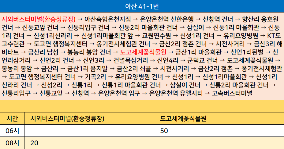 아산 41-1번: 시외버스터미널(환승정류장) → 아산축협온천지점 → 온양온천역 신한은행 → 신창역 건너 → 향산리 용호원 건너 → 신통교앞 건너 → 신통리입구 건너 → 신통2리 마을회관 건너 → 삼실이 → 신통1리 마을회관 → 신통1리 건너 → 신성1리신라리 → 신성1리마을회관 앞 → 교원연수원 → 신성1리 건너 → 유리요양병원 → KT도고수련관 → 도고면 행정복지센터 → 옹기전시체험관 건너 → 금산2리 점촌 건너 → 시전사거리 → 금산3리 해비타트 → 금산리 남성 → 봉농리 봉암 건너 → 도고세계꽃식물원 → 금산1리 마을회관 → 신언1리된벌 → 신언리삼거리 → 신언2리 건너 → 신언3리 → 건널목삼거리 → 신언4리 → 군덕교 건너 → 도고세계꽃식물원 → 봉농리 봉암 → 금산리 → 금산1리 음지말 → 금산2리 쇠골 → 시전사거리 → 금산2리 점촌 → 옹기전시체험관 → 도고면 행정복지센터 건너 → 기곡2리 → 유리요양병원 건너 → 신성1리 → 신성1리마을회관 → 신성1리신라리 건너 → 신성2리 → 신통1리 → 신통1리 마을회관 건너 → 삼실이 건너 → 신통2리 마을회관 건너 → 신통리입구 → 신통교앞 → 신창역 → 온양온천역 입구 → 온양온천역 유엘시티 → 고속버스터미널