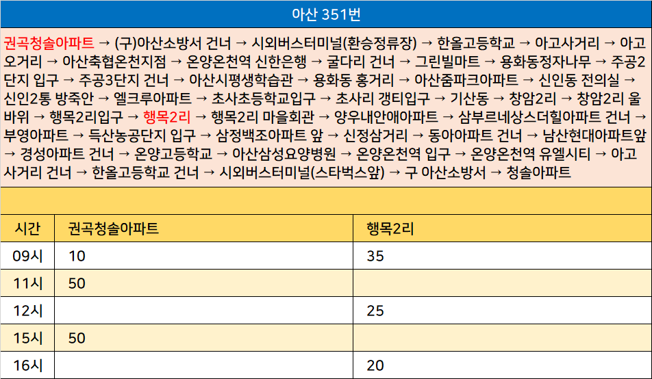 아산 351번: 권곡청솔아파트 → (구)아산소방서 건너 → 시외버스터미널(환승정류장) → 한올고등학교 → 아고사거리 → 아고오거리 → 아산축협온천지점 → 온양온천역 신한은행 → 굴다리 건너 → 그린빌마트 → 용화동정자나무 → 주공2단지 입구 → 주공3단지 건너 → 아산시평생학습관 → 용화동 홍거리 → 아산줌파크아파트 → 신인동 전의실 → 신인2통 방죽안 → 엘크루아파트 → 초사초등학교입구 → 초사리 갱티입구 → 기산동 → 창암2리 → 창암2리 울바위 → 행목2리입구 → 행목2리 → 행목2리 마을회관 → 양우내안애아파트 → 삼부르네상스더힐아파트 건너 → 부영아파트 → 득산농공단지 입구 → 삼정백조아파트 앞 → 신정삼거리 → 동아아파트 건너 → 남산현대아파트앞 → 경성아파트 건너 → 온양고등학교 → 아산삼성요양병원 → 온양온천역 입구 → 온양온천역 유엘시티 → 아고사거리 건너 → 한올고등학교 건너 → 시외버스터미널(스타벅스앞) → 구 아산소방서 → 청솔아파트
