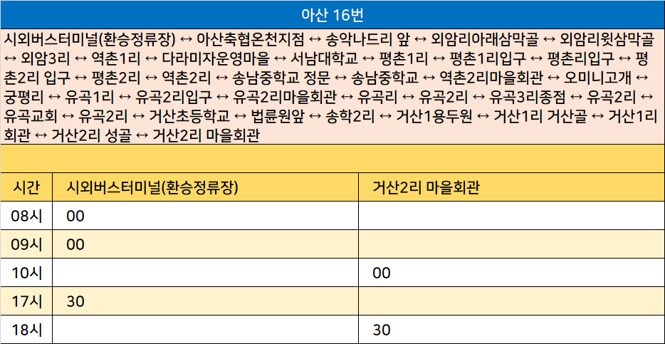 아산 16번: 시외버스터미널(환승정류장) ↔ 아산축협온천지점 ↔ 송악나드리 앞 ↔ 외암리아래삼막골 ↔ 외암리윗삼막골 ↔ 외암3리 ↔ 역촌1리 ↔ 다라미자운영마을 ↔ 서남대학교 ↔ 평촌1리 ↔ 평촌1리입구 ↔ 평촌리입구 ↔ 평촌2리 입구 ↔ 평촌2리 ↔ 역촌2리 ↔ 송남중학교 정문 ↔ 송남중학교 ↔ 역촌2리마을회관 ↔ 오미니고개 ↔ 궁평리 ↔ 유곡1리 ↔ 유곡2리입구 ↔ 유곡2리마을회관 ↔ 유곡리 ↔ 유곡2리 ↔ 유곡3리종점 ↔ 유곡2리 ↔ 유곡교회 ↔ 유곡2리 ↔ 거산초등학교 ↔ 법륜원앞 ↔ 송학2리 ↔ 거산1용두원 ↔ 거산1리 거산골 ↔ 거산1리회관 ↔ 거산2리 성골 ↔ 거산2리 마을회관