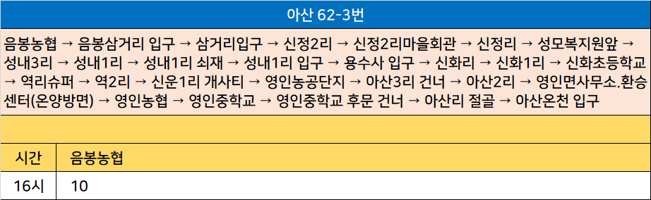 아산 62-3번: 음봉농협 → 음봉삼거리 입구 → 삼거리입구 → 신정2리 → 신정2리마을회관 → 신정리 → 성모복지원앞 → 성내3리 → 성내1리 → 성내1리 쇠재 → 성내1리 입구 → 용수사 입구 → 신화리 → 신화1리 → 신화초등학교 → 역리슈퍼 → 역2리 → 신운1리 개사티 → 영인농공단지 → 아산3리 건너 → 아산2리 → 영인면사무소.환승센터(온양방면) → 영인농협 → 영인중학교 → 영인중학교 후문 건너 → 아산리 절골 → 아산온천 입구