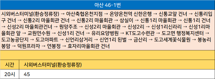 아산 46-1번: 시외버스터미널(환승정류장) → 아산축협온천지점 → 온양온천역 신한은행 → 신통교앞 건너 → 신통리입구 건너 → 신통2리 마을회관 건너 → 신통2리 마을회관 → 삼실이 → 신통1리 마을회관 → 신통1리 건너 → 신성2리 마을회관건너 → 원앙주조 → 신성2리 마을회관 → 신성2리 → 신성1리신라리 → 신성1리마을회관 앞 → 교원연수원 → 신성1리 건너 → 유리요양병원 → KT도고수련관 → 도고면 행정복지센터 → 도고농공단지 → 도고아파트 → 신언리삼거리 → 신언1리 된벌 → 금산리 → 도고세계꽃식물원 → 봉농리 봉암 → 덕원프라자 → 연봉정 → 효자리마을회관 건너