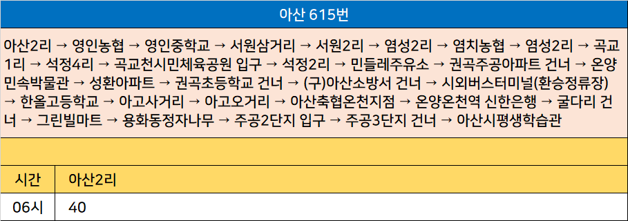 아산 615번: 아산2리 → 영인농협 → 영인중학교 → 서원삼거리 → 서원2리 → 염성2리 → 염치농협 → 염성2리 → 곡교1리 → 석정4리 → 곡교천시민체육공원 입구 → 석정2리 → 민들레주유소 → 권곡주공아파트 건너 → 온양민속박물관 → 성환아파트 → 권곡초등학교 건너 → (구)아산소방서 건너 → 시외버스터미널(환승정류장) → 한올고등학교 → 아고사거리 → 아고오거리 → 아산축협온천지점 → 온양온천역 신한은행 → 굴다리 건너 → 그린빌마트 → 용화동정자나무 → 주공2단지 입구 → 주공3단지 건너 → 아산시평생학습관