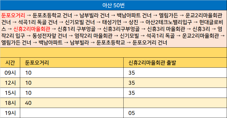 아산 50번: 둔포오거리 → 둔포초등학교 건너 → 남부빌라 건너 → 백남아파트 건너 → 엘림가든 → 운교2리마을회관 건너 → 석곡1리 독골 건너 → 신기모빌 건너 → 태성기연 → 상진 → 아산2테크노밸리입구 → 현대글로비스 → 신휴2리마을회관 → 신휴1리 구부엉골 → 신휴3리구부엉골 → 신휴3리 마을회관 → 신휴3리 → 염작2리 입구 → 동성전자앞 건너 → 염작2리 마을회관 → 신기모빌 → 석곡1리 독골 → 운교2리마을회관 → 엘림가든 건너 → 백남아파트 → 남부빌라 → 둔포초등학교 → 둔포오거리 건너
