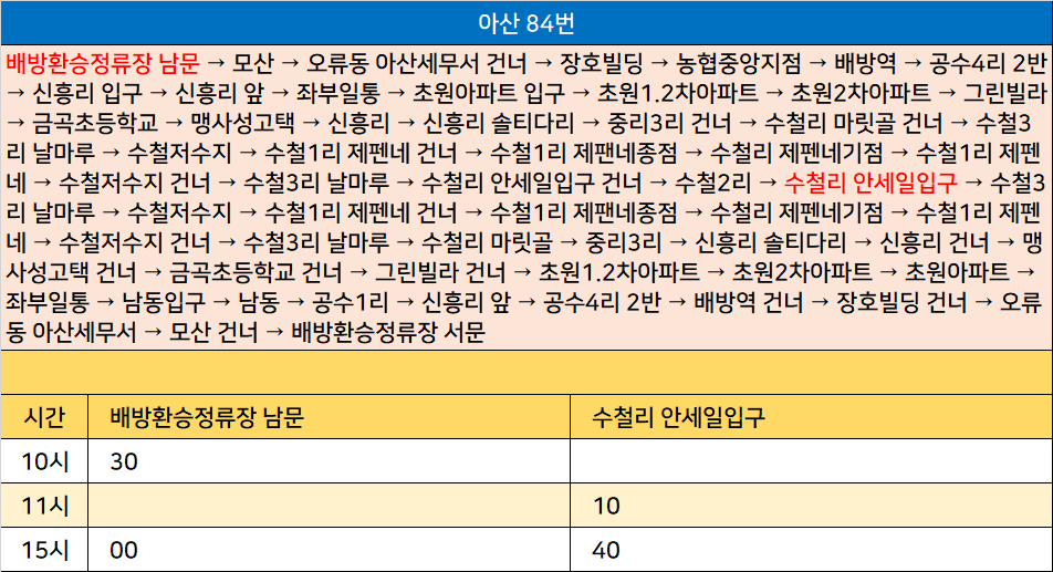 아산 84번: 배방환승정류장 남문 → 모산 → 오류동 아산세무서 건너 → 장호빌딩 → 농협중앙지점 → 배방역 → 공수4리 2반 → 신흥리 입구 → 신흥리 앞 → 좌부일통 → 초원아파트 입구 → 초원1.2차아파트 → 초원2차아파트 → 그린빌라 → 금곡초등학교 → 맹사성고택 → 신흥리 → 신흥리 솔티다리 → 중리3리 건너 → 수철리 마릿골 건너 → 수철3리 날마루 → 수철저수지 → 수철1리 제펜네 건너 → 수철1리 제팬네종점 → 수철리 제펜네기점 → 수철1리 제펜네 → 수철저수지 건너 → 수철3리 날마루 → 수철리 안세일입구 건너 → 수철2리 → 수철리 안세일입구 → 수철3리 날마루 → 수철저수지 → 수철1리 제펜네 건너 → 수철1리 제팬네종점 → 수철리 제펜네기점 → 수철1리 제펜네 → 수철저수지 건너 → 수철3리 날마루 → 수철리 마릿골 → 중리3리 → 신흥리 솔티다리 → 신흥리 건너 → 맹사성고택 건너 → 금곡초등학교 건너 → 그린빌라 건너 → 초원1.2차아파트 → 초원2차아파트 → 초원아파트 → 좌부일통 → 남동입구 → 남동 → 공수1리 → 신흥리 앞 → 공수4리 2반 → 배방역 건너 → 장호빌딩 건너 → 오류동 아산세무서 → 모산 건너 → 배방환승정류장 서문