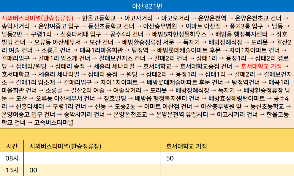 아산 821번: 시외버스터미널(환승정류장) → 한올고등학교 → 아고사거리 → 아고오거리 → 온양온천역 → 온양온천초교 건너 → 송악사거리 → 온양여중고 입구 → 동신초등학교 건너 → 아산충무병원 → 이마트 아산점 → 풍기3통 입구 → 남동 → 남동2반 → 구령1리 → 신흥다세대 입구 → 공수4리 건너 → 배방5차한성필하우스 → 배방읍 행정복지센터 → 장호빌딩 건너 → 오류동 아산세무서 → 모산 건너 → 배방환승정류장 서문 → 독자기 → 배방장례식장 → 도리못 → 갈산2리 여술 건너 → 소룡골 건너 → 매곡1리마을회관 → 탕정역 → 배방롯데캐슬아파트 후문 → 자이1차아파트 건너 → 갈매리입구 → 갈매1리 암소개 건너 → 갈매보건지소 건너 → 갈매2리 건너 → 삼태1리 → 용정1리 → 삼태2리 경로당 → 삼태리/원당 → 삼태리 종점 → 세출리 세나리펄 → 호서대학교 → 호서대학교종점 건너 → 호서대학교 기점 → 호서대학교 → 세출리 세나리펄 → 삼태리 종점 → 원당 → 삼태2리 → 용정1리 → 삼태1리 → 갈매2리 → 갈매보건지소 → 갈매1리 암소개 → 갈매리입구 → 자이1차아파트 → 배방롯데캐슬아파트 후문 건너 → 탕정역건너 → 매곡1리마을회관 건너 → 소룡골 → 갈산2리 여술 → 여술삼거리 → 도리못 → 배방장례식장 → 독자기 → 배방환승정류장 남문 → 모산 → 오류동 아산세무서 건너 → 장호빌딩 → 배방읍 행정복지센터 건너 → 배방효성해링턴아파트 → 공수4리 → 신흥다세대 → 구령1리 건너 → 신동 → 모종2통 → 이마트 아산점 건너 → 아산충무병원 앞 → 동신초등학교 → 온양여중고 입구 건너 → 송악사거리 건너 → 온양온천초교 → 온양온천역 유엘시티 → 아고사거리 건너 → 한올고등학교 건너 → 고속버스터미널