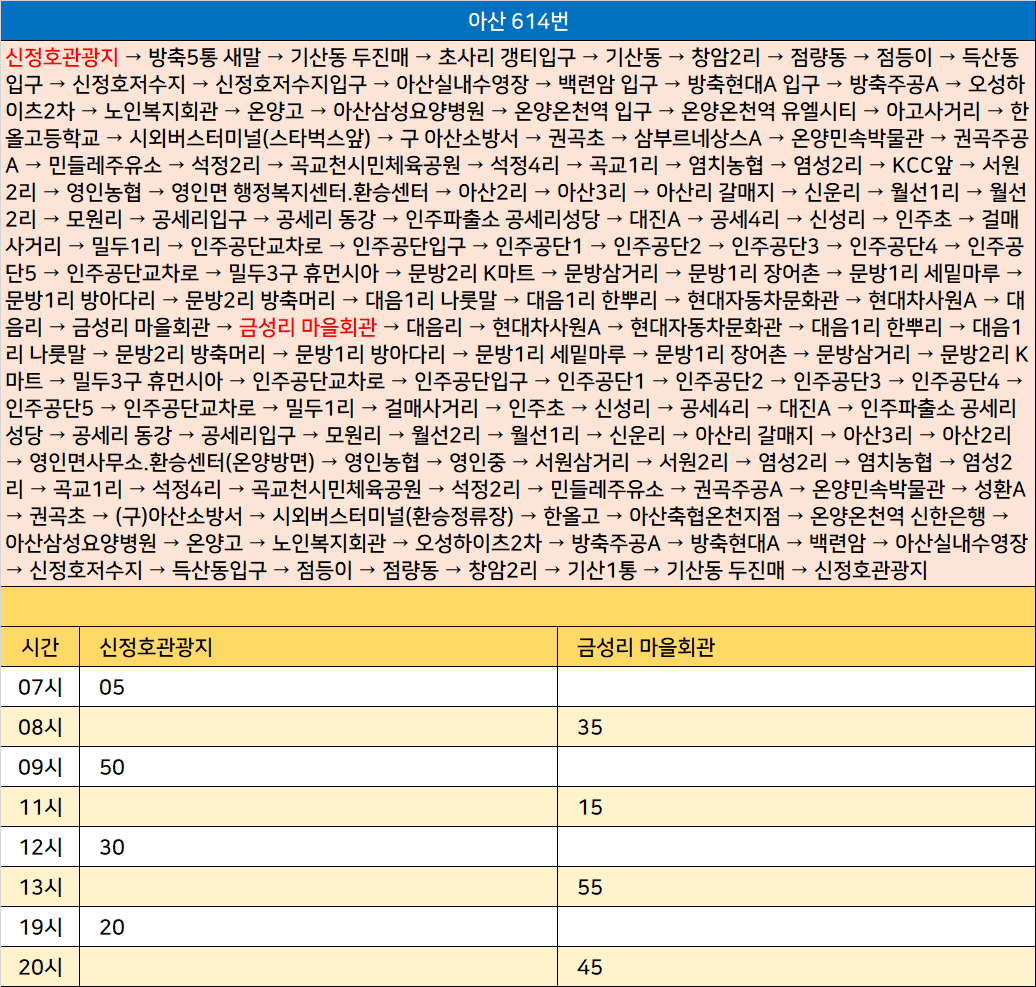 아산 614번: 신정호관광지 건너 → 방축5통 새말 → 기산동 두진매 → 초사리 갱티입구 → 기산동 → 창암2리 → 점량동 건너 → 점등이 → 득산동입구 → 신정호저수지 앞 → 신정호저수지입구 건너 → 아산실내수영장 건너 → 백련암 입구 → 방축현대A 입구 → 방축주공A → 오성하이츠2차 건너 → 노인복지회관 앞 → 온양고등학교 → 아산삼성요양병원 → 온양온천역 입구 → 온양온천역 유엘시티 → 아고사거리 건너 → 한올고등학교 건너 → 시외버스터미널(스타벅스앞) → 구 아산소방서 → 권곡초등학교 → 삼부르네상스A → 온양민속박물관 건너 → 권곡주공A → 민들레주유소 앞 → 석정2리 → 곡교천시민체육공원 → 석정4리 건너 → 석정4리 입구 → 곡교1리 건너 → 염치농협 → 염성2리 → KCC앞 → 서원2리 건너 → 영인농협 건너 → 영인면 행정복지센터.환승센터 → 아산2리 → 아산3리 → 아산리 갈매지 → 신운리 건너 → 월선1리 건너 → 월선2리 건너 → 모원리 건너 → 공세리입구 → 공세리 동강 앞 → 인주파출소 공세리성당 앞 → 대진A → 공세4리 건너 → 신성리 → 인주초등학교 건너 → 걸매사거리 → 밀두1리 → 인주공단교차로 → 인주공단입구 → 인주공단1 → 인주공단2 → 인주공단3 → 인주공단4 → 인주공단5 → 인주공단교차로 앞 → 밀두3구 휴먼시아 건너 → 문방2리 K마트 → 문방삼거리 → 문방1리 장어촌 → 문방1리 세밑마루 → 문방1리 방아다리 → 문방2리 방축머리 → 대음1리 나룻말 → 대음1리 한뿌리 → 현대자동차문화관 → 현대차사원A → 대음리 건너 → 금성리 마을회관 건너 → 금성리 마을회관 → 대음리 → 현대차사원A 건너 → 현대자동차문화관 건너 → 대음1리 한뿌리 → 대음1리 나룻말 → 문방2리 방축머리 → 문방1리 방아다리 → 문방1리 세밑마루 → 문방1리 장어촌 → 문방삼거리 → 문방2리 K마트 → 밀두3구 휴먼시아 → 인주공단교차로 → 인주공단입구 → 인주공단1 → 인주공단2 → 인주공단3 → 인주공단4 → 인주공단5 → 인주공단교차로 앞 → 밀두1리 → 걸매사거리 → 인주초등학교 → 신성리 건너 → 공세4리 → 대진A → 인주파출소 공세리성당 → 공세리 동강 → 공세리입구 → 모원리 → 월선2리 → 월선1리 → 신운리 → 아산리 갈매지 → 아산3리 건너 → 아산2리 → 영인면사무소.환승센터(온양방면) → 영인농협 → 영인중학교 → 서원삼거리 → 서원2리 → 염성2리 → 염치농협 → 염성2리 → 곡교1리 → 석정4리 → 곡교천시민체육공원 입구 → 석정2리 → 민들레주유소 → 권곡주공A 건너 → 온양민속박물관 → 성환A → 권곡초등학교 건너 → (구)아산소방서 건너 → 시외버스터미널(환승정류장) → 한올고등학교 → 아고사거리 → 아고오거리 → 아산축협온천지점 → 온양온천역 신한은행 → 아산삼성요양병원 건너 → 온양고등학교 정문 → 노인복지회관 → 오성하이츠2차 → 방축주공A → 방축현대A → 백련암 → 아산실내수영장 → 신정호저수지입구 → 신정호저수지 → 득산동입구 → 점등이 → 점량동 → 창암2리 → 기산1통 → 기산동 두진매 → 신정호관광지