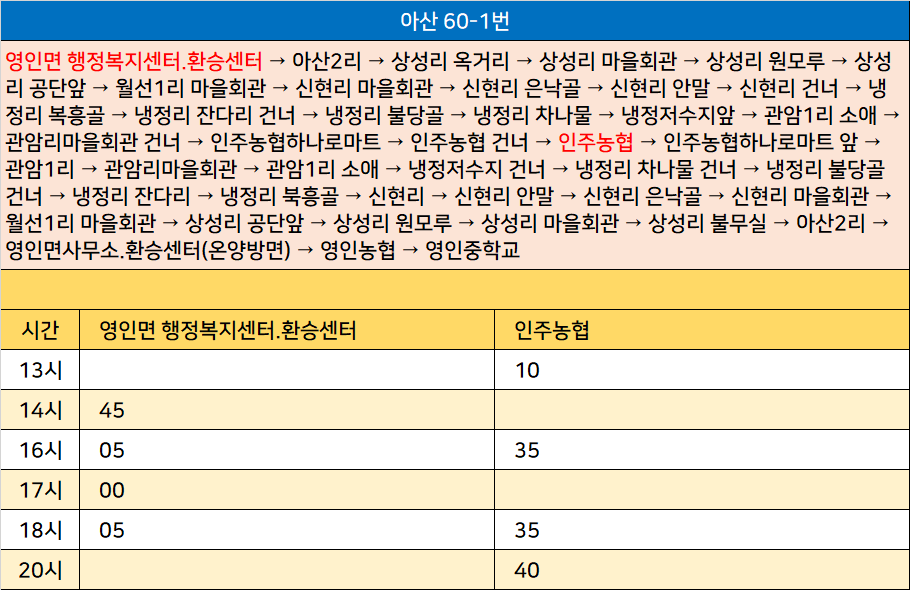 아산 60-1번: 영인면 행정복지센터.환승센터 → 아산2리 → 상성리 옥거리 → 상성리 마을회관 → 상성리 원모루 → 상성리 공단앞 → 월선1리 마을회관 → 신현리 마을회관 → 신현리 은낙골 → 신현리 안말 → 신현리 건너 → 냉정리 복흥골 → 냉정리 잔다리 건너 → 냉정리 불당골 → 냉정리 차나물 → 냉정저수지앞 → 관암1리 소애 → 관암리마을회관 건너 → 인주농협하나로마트 → 인주농협 건너 → 인주농협 → 인주농협하나로마트 앞 → 관암1리 → 관암리마을회관 → 관암1리 소애 → 냉정저수지 건너 → 냉정리 차나물 건너 → 냉정리 불당골 건너 → 냉정리 잔다리 → 냉정리 북흥골 → 신현리 → 신현리 안말 → 신현리 은낙골 → 신현리 마을회관 → 월선1리 마을회관 → 상성리 공단앞 → 상성리 원모루 → 상성리 마을회관 → 상성리 불무실 → 아산2리 → 영인면사무소.환승센터(온양방면) → 영인농협 → 영인중학교