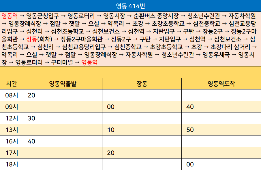 영동 414번: 영동역 → 영동군청입구 → 영동로터리 → 영동시장 → 순환버스 중앙시장 → 청소년수련관 → 자동차학원 → 영동장례식장 → 점말 → 잿말 → 으실 → 약목리 → 초강 → 초강초등학교 → 심천중학교 → 심천교용당리입구 → 심천리 → 심천초등학교 → 심천보건소 → 심천역 → 지탄입구 → 구탄 → 장동2구 → 장동2구마을회관 → 장동(회차) → 장동2구마을회관 → 장동2구 → 구탄 → 지탄입구 → 심천역 → 심천보건소 → 심천초등학교 → 심천리 → 심천교용당리입구 → 심천중학교 → 초강초등학교 → 초강 → 초강다리 삼거리 → 약목리 → 으실 → 잿말 → 점말 → 영동장례식장 → 자동차학원 → 청소년수련관 → 영동우체국 → 영동시장 → 영동로터리 → 구터미널 → 영동역